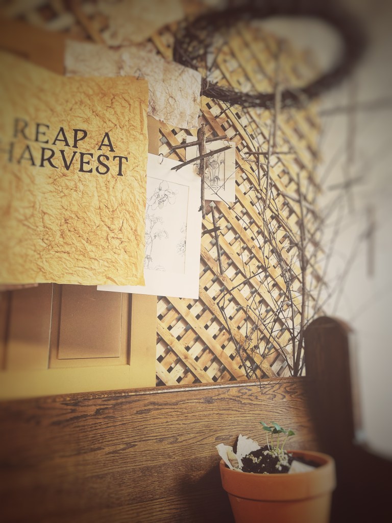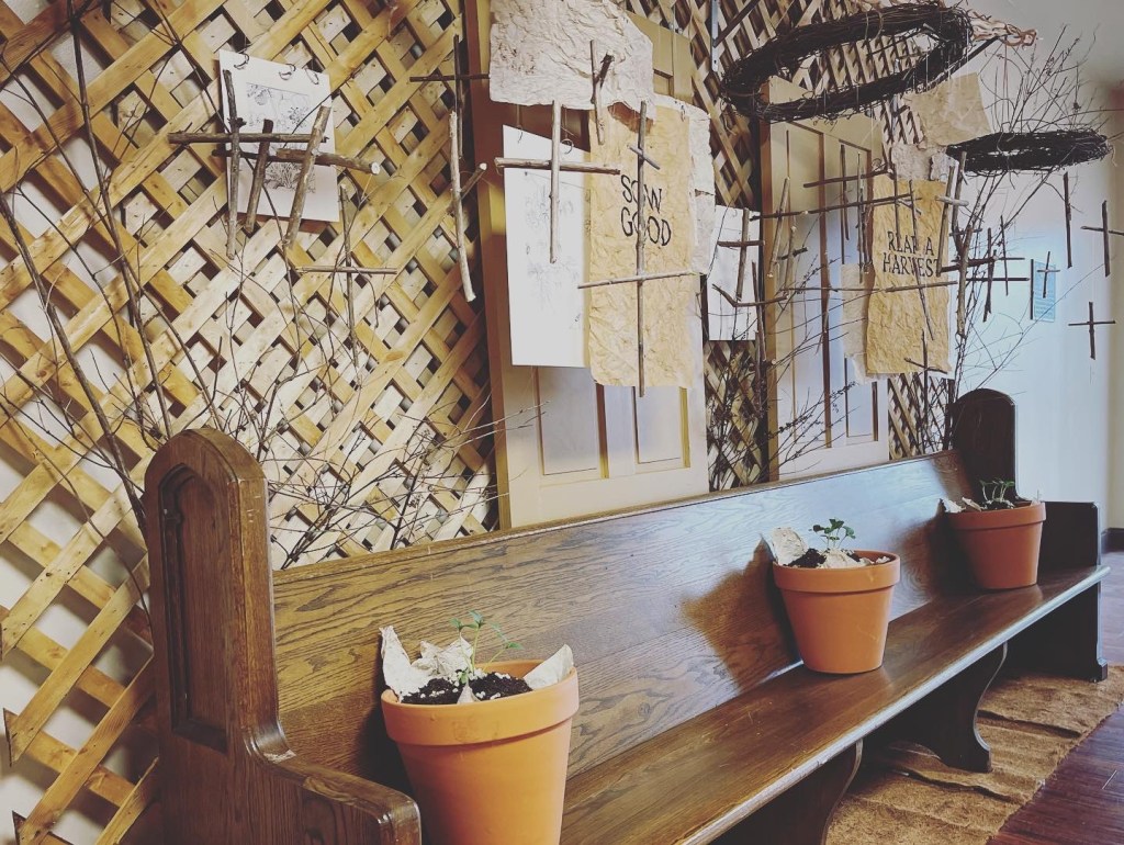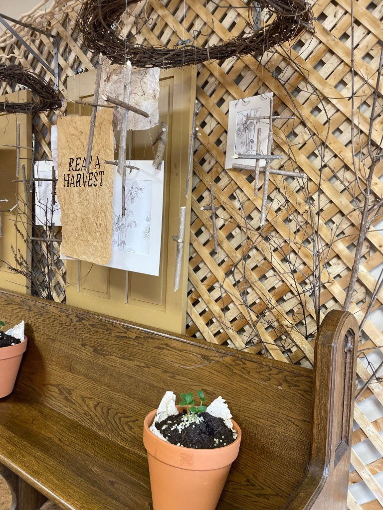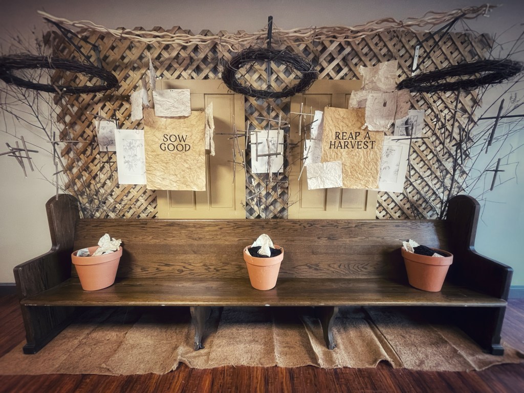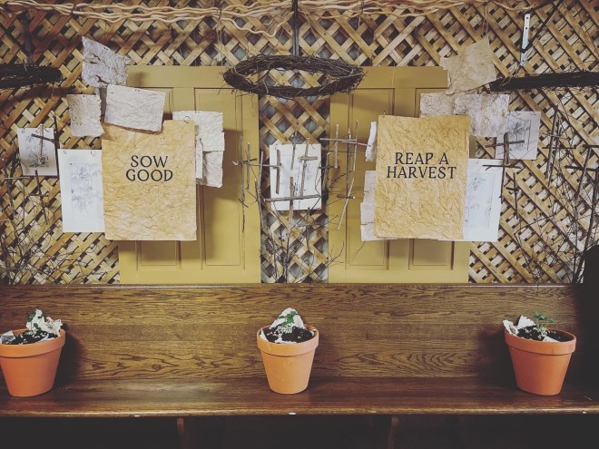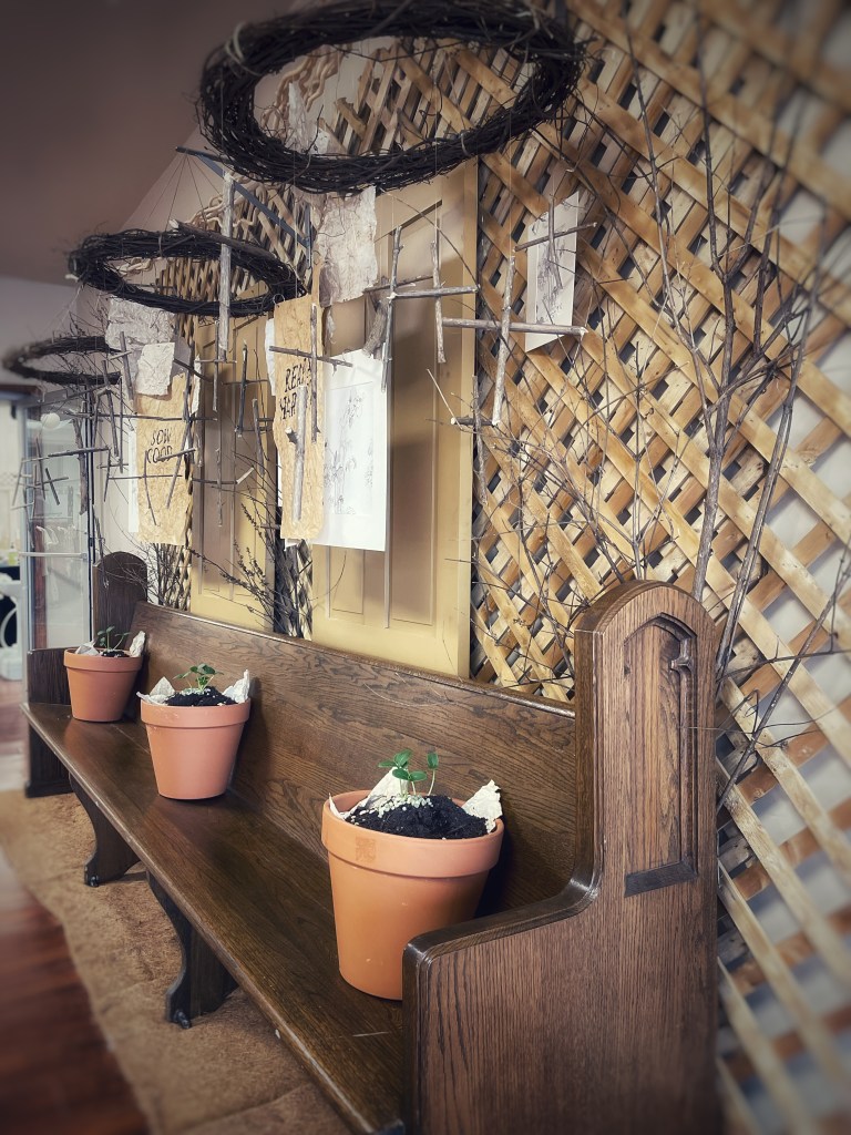 Despite this design flaw, the display I believe turned out lovely. I layered the background with raw lattice that we backed with a sheer cream curtain, centered two mustard colored track doors for a pop of color, and planked the center of the display with the solid oak church pew. I scored the amazing burlap sheets to place underneath it all and dress up/ground the space. I chose three simple terracotta pots loaded with nutrient packed soil, sprinkled with seeds for the visual and tiny sprouts of growth. Three—specifically to represent the trinity: God the Father, Jesus the Son and the Holy Spirit. What I love the most is the visual of the spiritual aspect here. Yes—you see the physical act that takes place in planting represented in the pots, but what I wanted the display to show more is the “growth” continued from the tiny sprouts and transitioned into the image of “spiritual growth” by having the three custom created pieces hanging directly above the pots of growing life. It’s working to be an actual visual of the continual growth you can have by nurturing your relationship with Jesus. Together, I believe it laid out a good foundation, reminiscent of an old church—and hopefully, a nostalgic reminder to draw you closer to Christ or beckon you back to Him. If He is unknown to you, hopefully it’s an inspiring display that makes you curious about who He is.