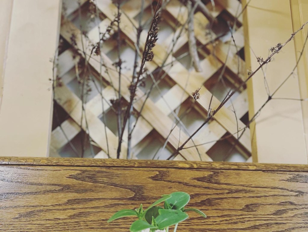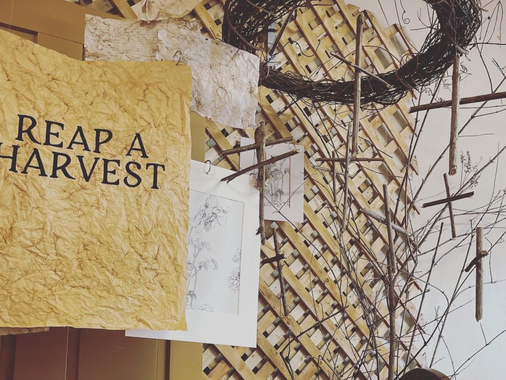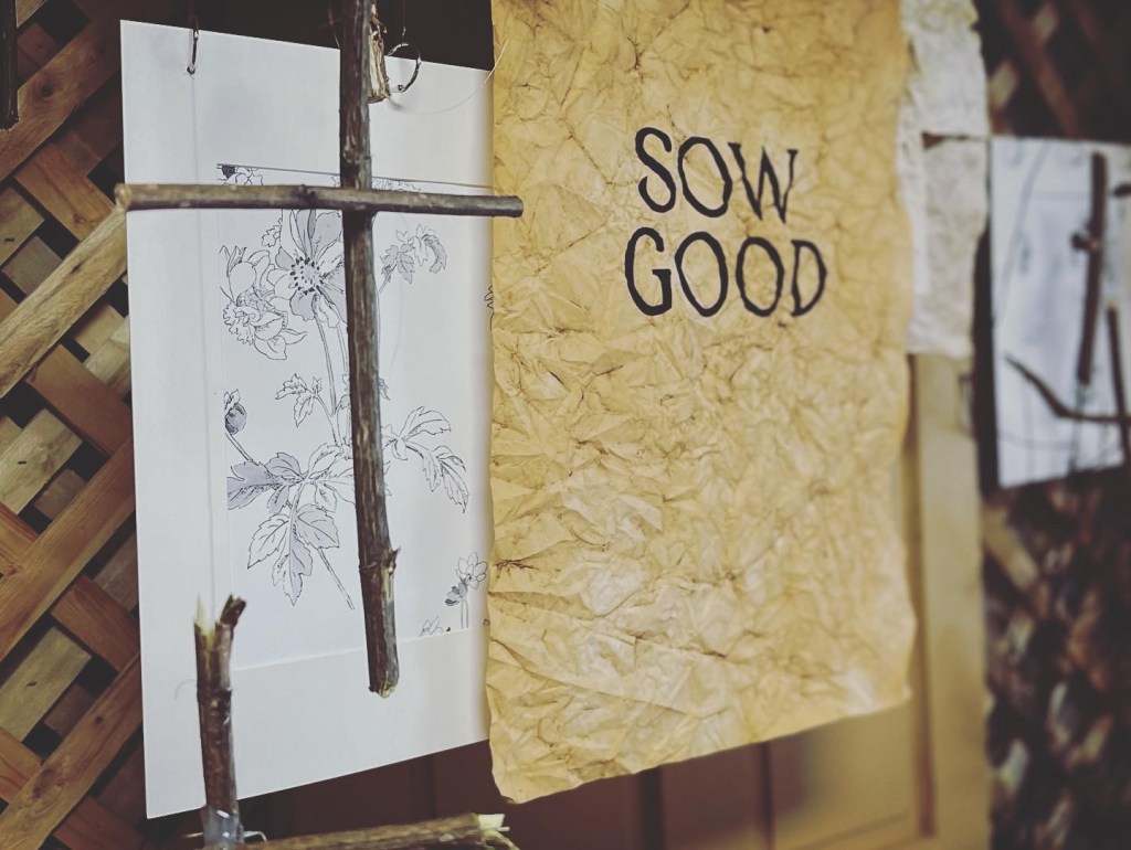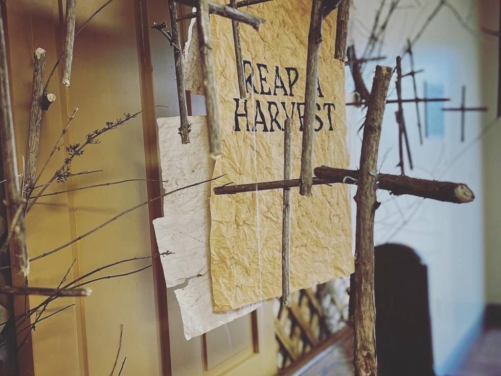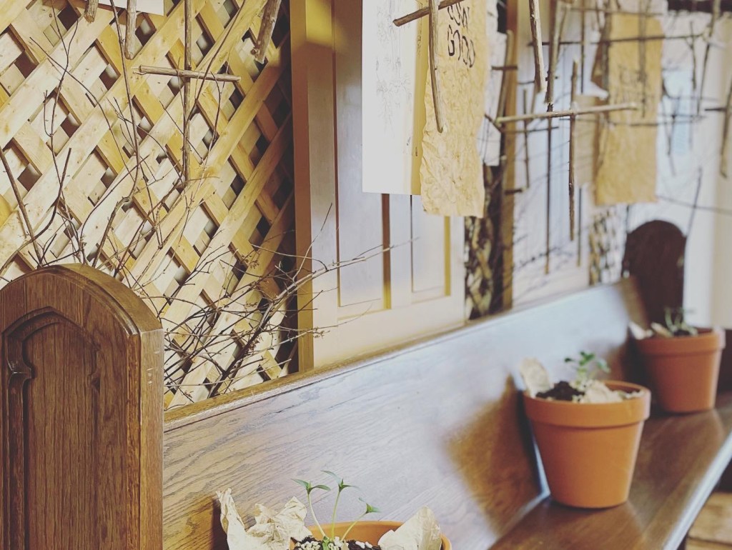Despite this design flaw, the display I believe turned out lovely. I layered the background with raw lattice that we backed with a sheer cream curtain, centered two mustard colored track doors for a pop of color, and planked the center of the display with the solid oak church pew. I scored the amazing burlap sheets to place underneath it all and dress up/ground the space. I chose three simple terracotta pots loaded with nutrient packed soil, sprinkled with seeds for the visual and tiny sprouts of growth. Three—specifically to represent the trinity: God the Father, Jesus the Son and the Holy Spirit. What I love the most is the visual of the spiritual aspect here. Yes—you see the physical act that takes place in planting represented in the pots, but what I wanted the display to show more is the “growth” continued from the tiny sprouts and transitioned into the image of “spiritual growth” by having the three custom created pieces hanging directly above the pots of growing life. It’s working to be an actual visual of the continual growth you can have by nurturing your relationship with Jesus. Together, I believe it laid out a good foundation, reminiscent of an old church—and hopefully, a nostalgic reminder to draw you closer to Christ or beckon you back to Him. If He is unknown to you, hopefully it’s an inspiring display that makes you curious about who He is.