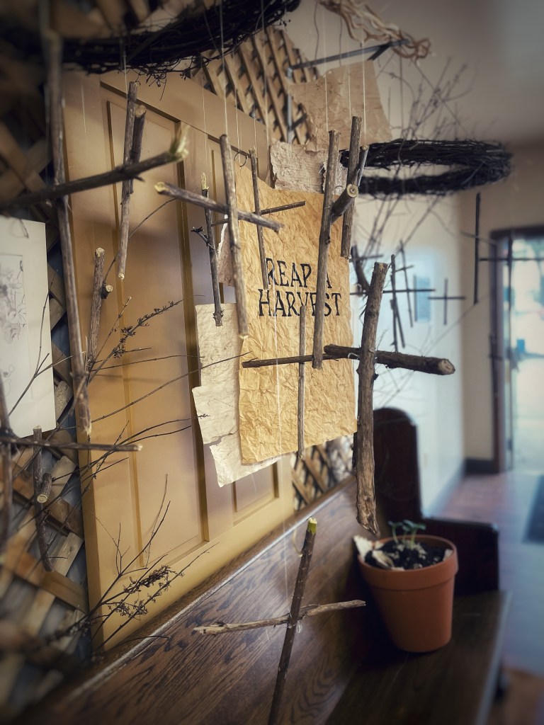 I will tell you those butterfly bushes we pruned in our yard came in quite handy. I was able to utilize them in two of the displays (#winning). For this one in particular, I used them as necessary floral fill and I truly spent a couple of hours cutting by hand tiny pieces of these branches. The kiddos and I spent a good while hot gluing a large basket of the handmade crosses from it. Good memories now. They surprisingly held up well in the display. I wanted all sorts of varying sizes and lengths and I fell in love when I saw the large wreaths at Hobby Lobby that reminded me of the crown of thorns and made the perfect anchor for these handmade crosses to hang from. We made a good hanging system by utilizing shelf brackets and layering them with raw decorative sticks to support it all. Several of us spent hours hanging all these from fishing line to place in the display. All the work was worth the visual story it made. I enjoy the fact that they are sort of a natural wind chime visually—a spiritual concept if you will.