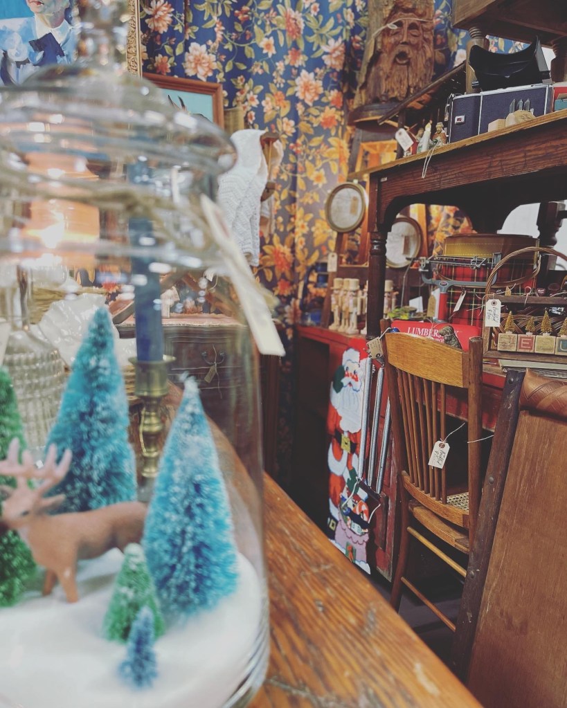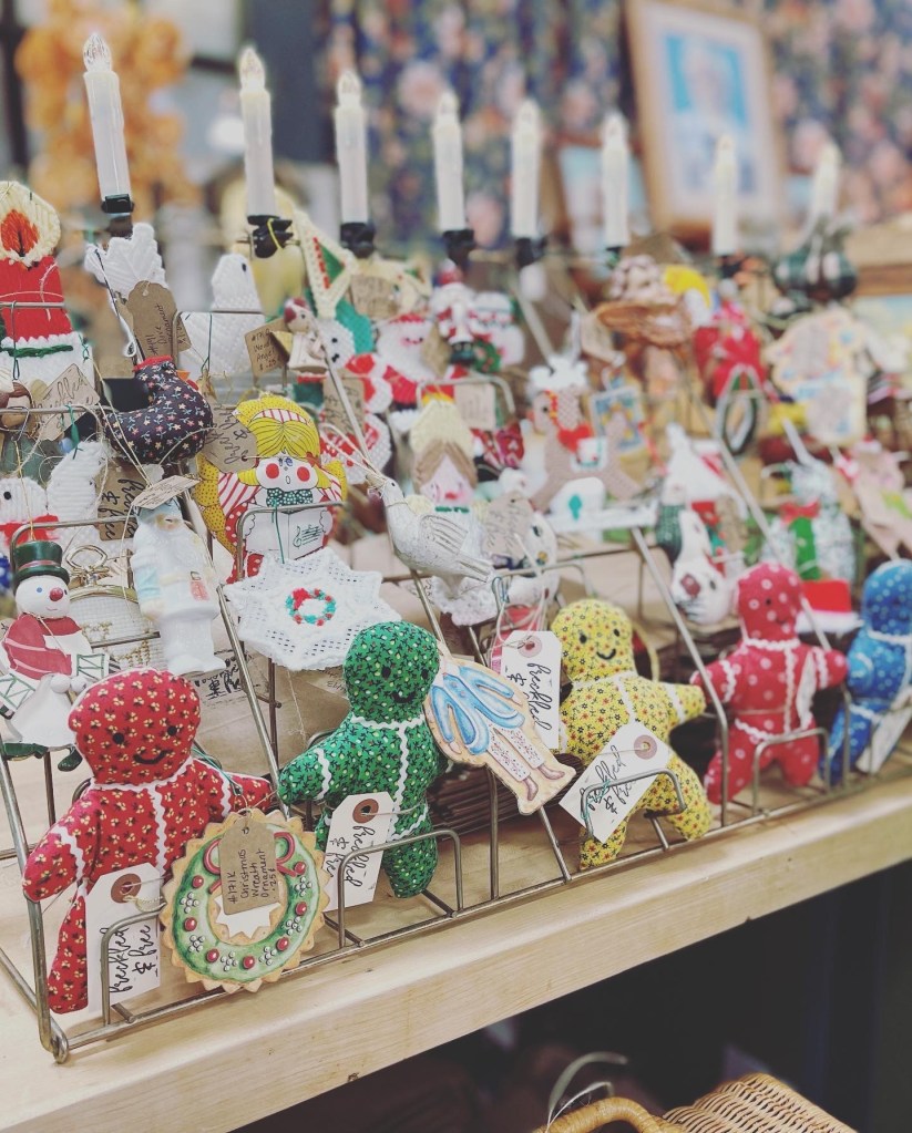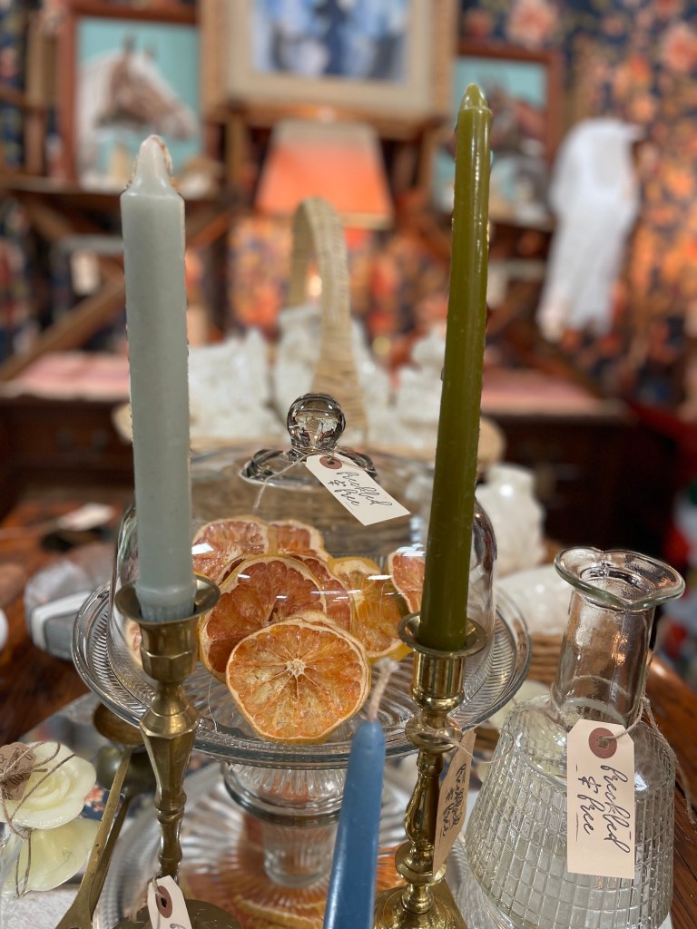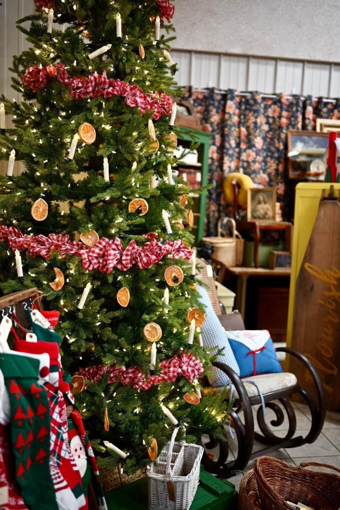Replicas of antique tree candles throughout for decoration and ambiance. Vintage hand-picked ornaments of plenty for purchase.