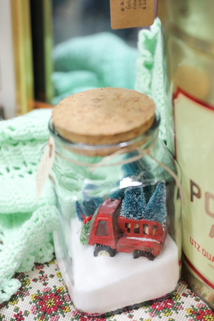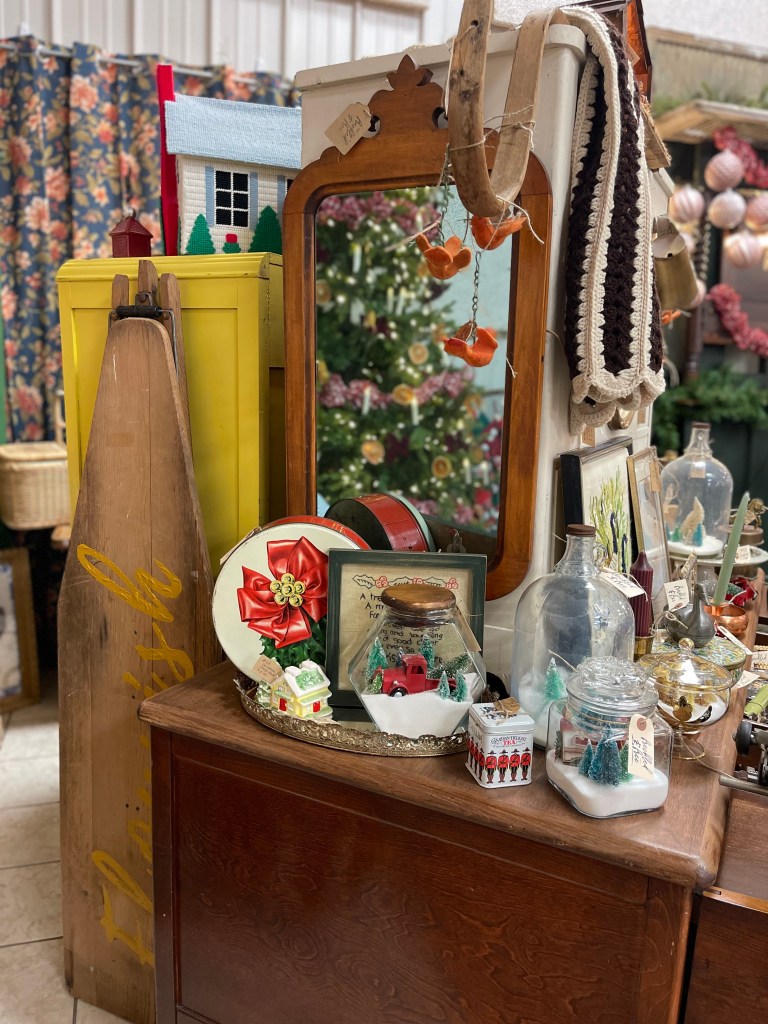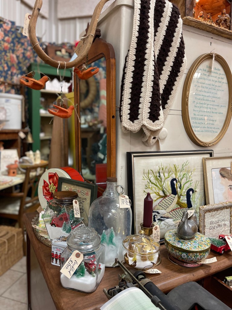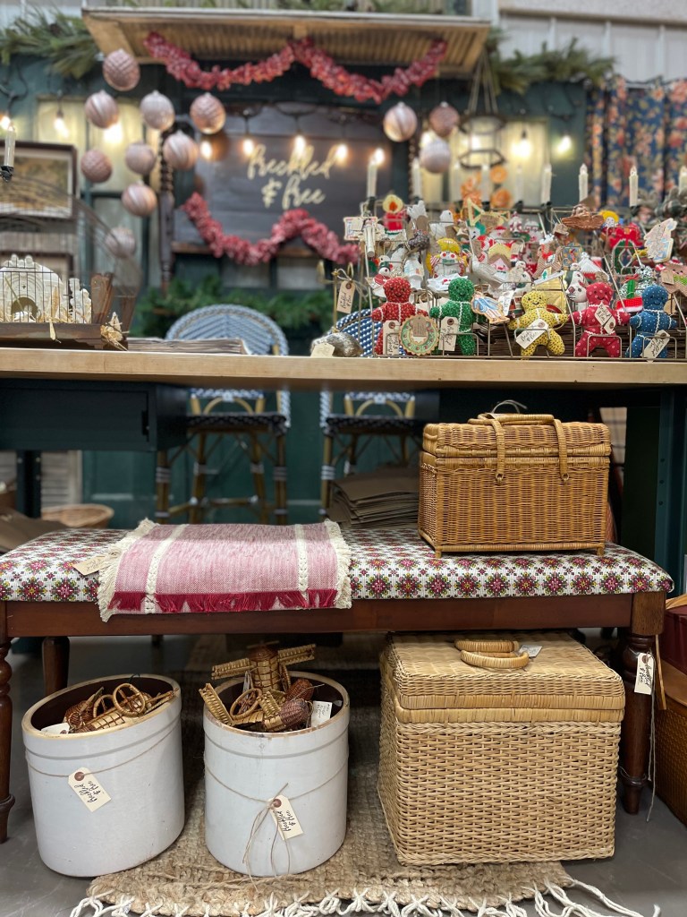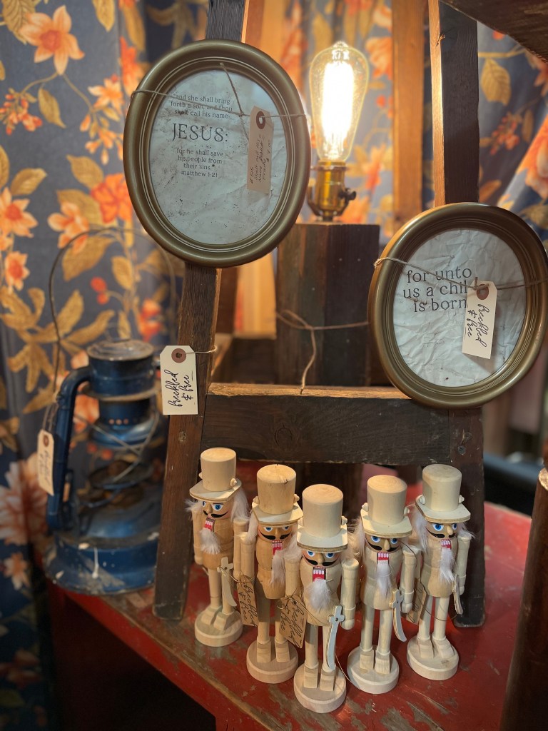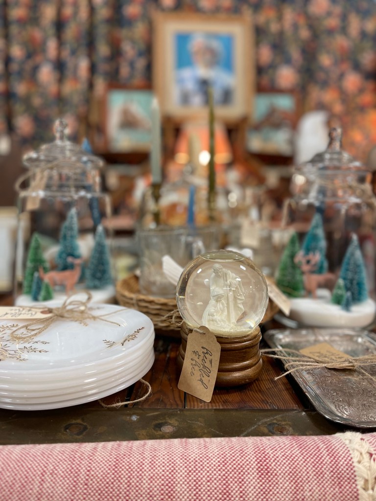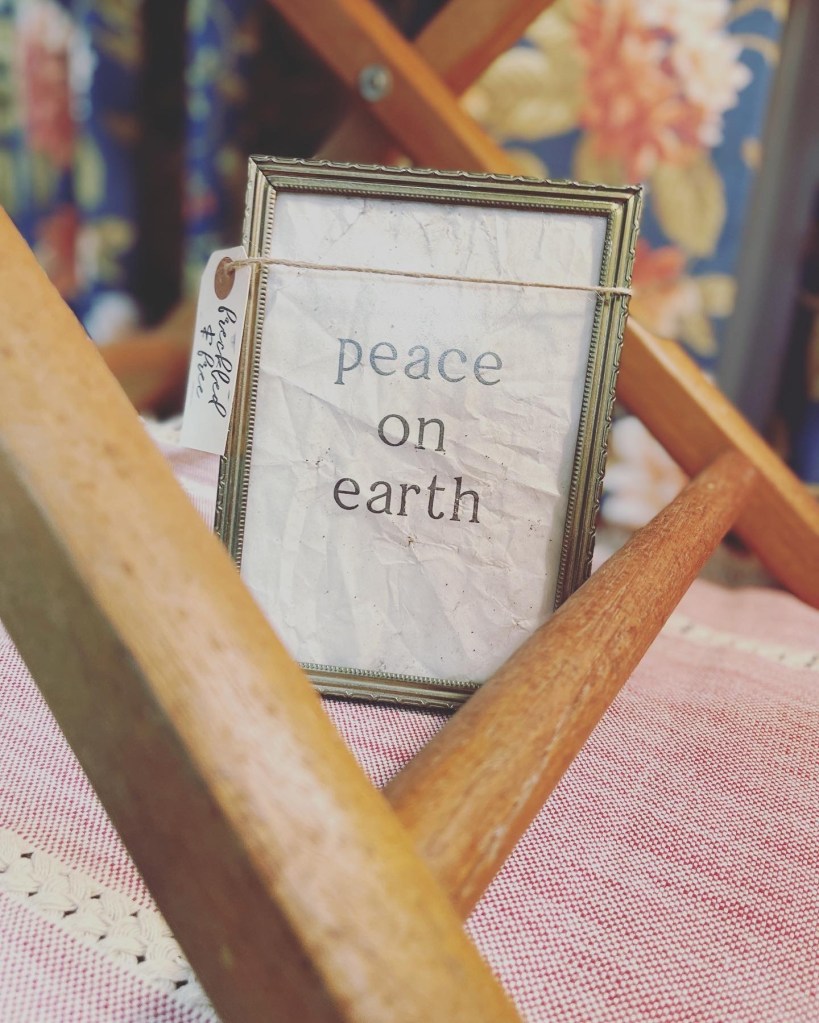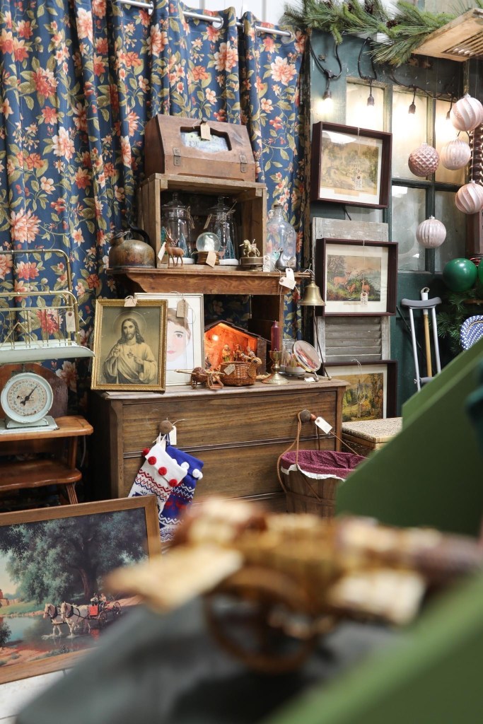 Creating little holiday scenes for that dreamy Christmas feel made it all so special. We spent a lot of time looking for vintage and antique glass jars with lids where I could make these. Some with deer and pine trees, others with vintage trucks on tree farms and my favorite scene were the tiny ships I pretended had frozen in the water upon the rocks. As a child little Christmas scenes were my favorite things that made me get lost in wonder. We spent so many hours making many beautiful things leading up to the market and I’m a little bummed I didn’t get alone shots of all of them. From the One Way Sign we turned into a rolling cabinet with shelving inside and even added lighting, to the small wooden kitchen island we made from old work bench legs and a gorgeous wood top we picked up at a yard sale, bird cages turned into lovely nativity scenes, to the gorgeous re-fabriced boho bench. Honestly, there is just way too many good stories to share on all the goodies we were able to bring. From making my own tags and framing custom artwork with holiday sayings was…just. plain. fun. And I know I keep saying it’s so fun, but it’s simply true! All my favorite things. We spent lots of hours cleaning, tagging and pricing beforehand to have everything ready for market opening.