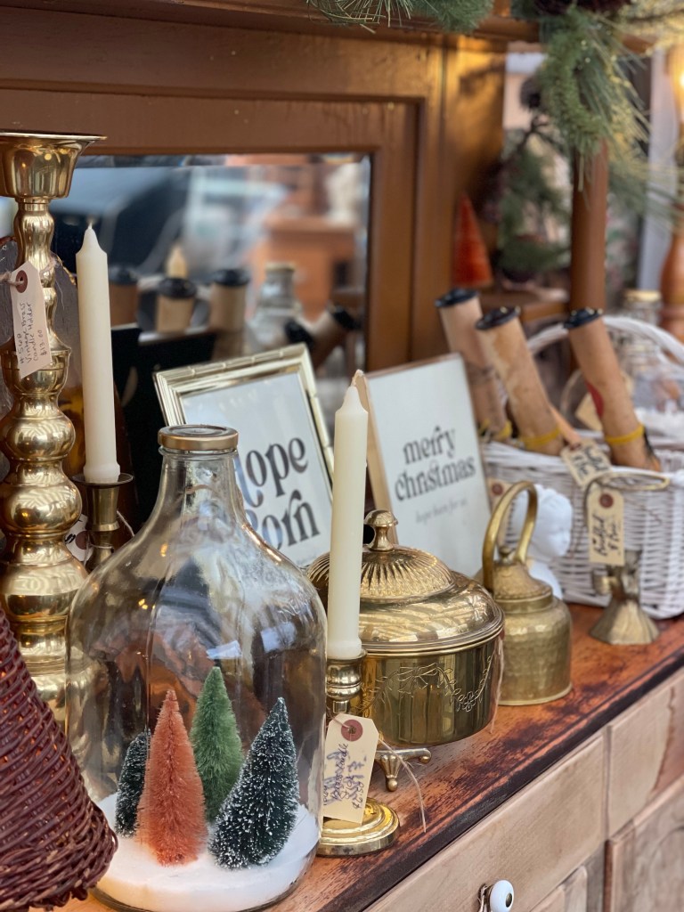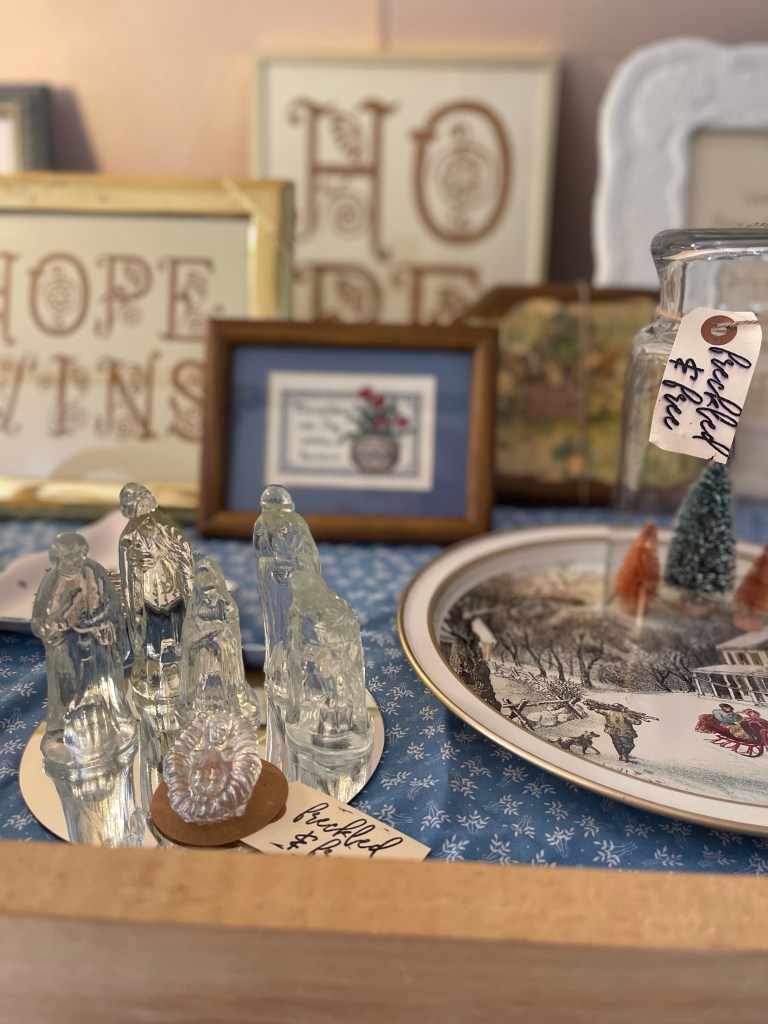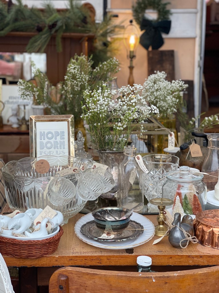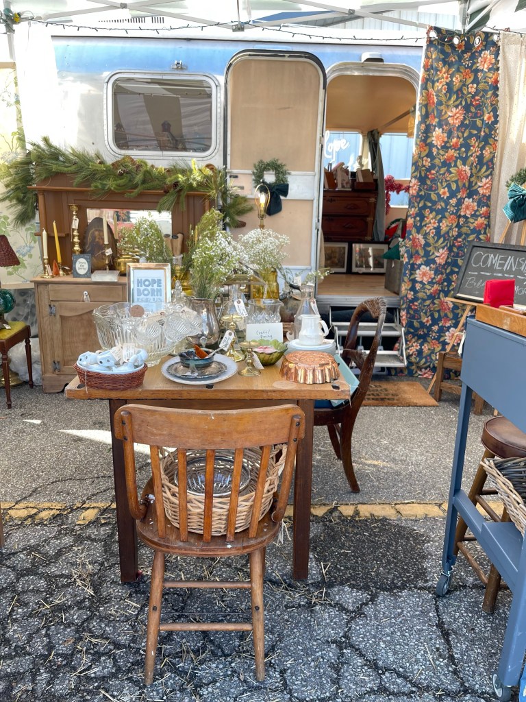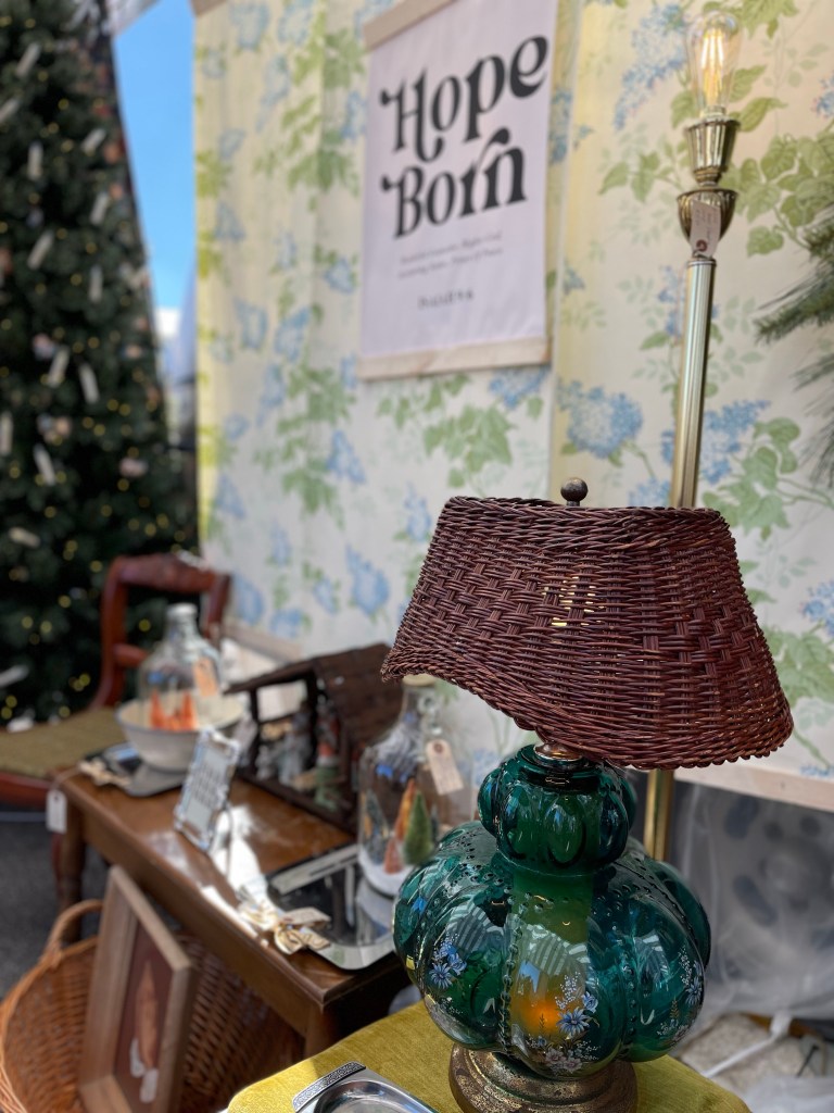 I tried to keep the booth focused on the beauty of Christmas in a simple, natural way on the outside of the airstream. Simple blues, creams and oranges. Brass, silver and dainty finds scattered throughout with a Christmas tree adorned in only vintage looking tree candles to create a cozy feel. The simplicity of the greenery and glow of the candles was all she needed. Many Freckled & Free custom birdcage nativities and artwork sprinkled throughout to create the overall feels of the season. A large focal wall of blue, green and white floral wall paper sheets, centered with the “Hope Born” graphic to ground the outdoor booth design. Wintery florals and things that shimmer and shine. I wanted Jesus to be the story even amongst antiques and vintage goods. Hope can be found here. Feliz Navidad.