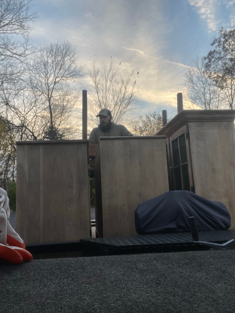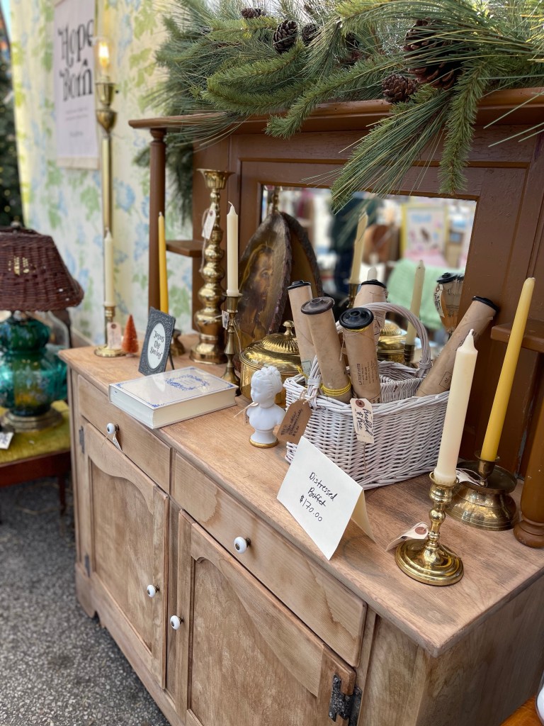 Tom worked hard distressing two large pieces of fine furniture for the winter market. Our first try of the “oven cleaner technique” worked beautifully. The custom hutch and dining buffet turned out gorgeous, as you can see below. The vintage brown top on the dining buffet we scored on marketplace. It was an old fireplace mirrored mantle that we mounted to the dining buffet to make a one-of-a-kind piece. We couldn’t be happier with how it turned out.