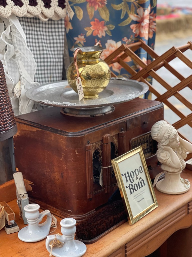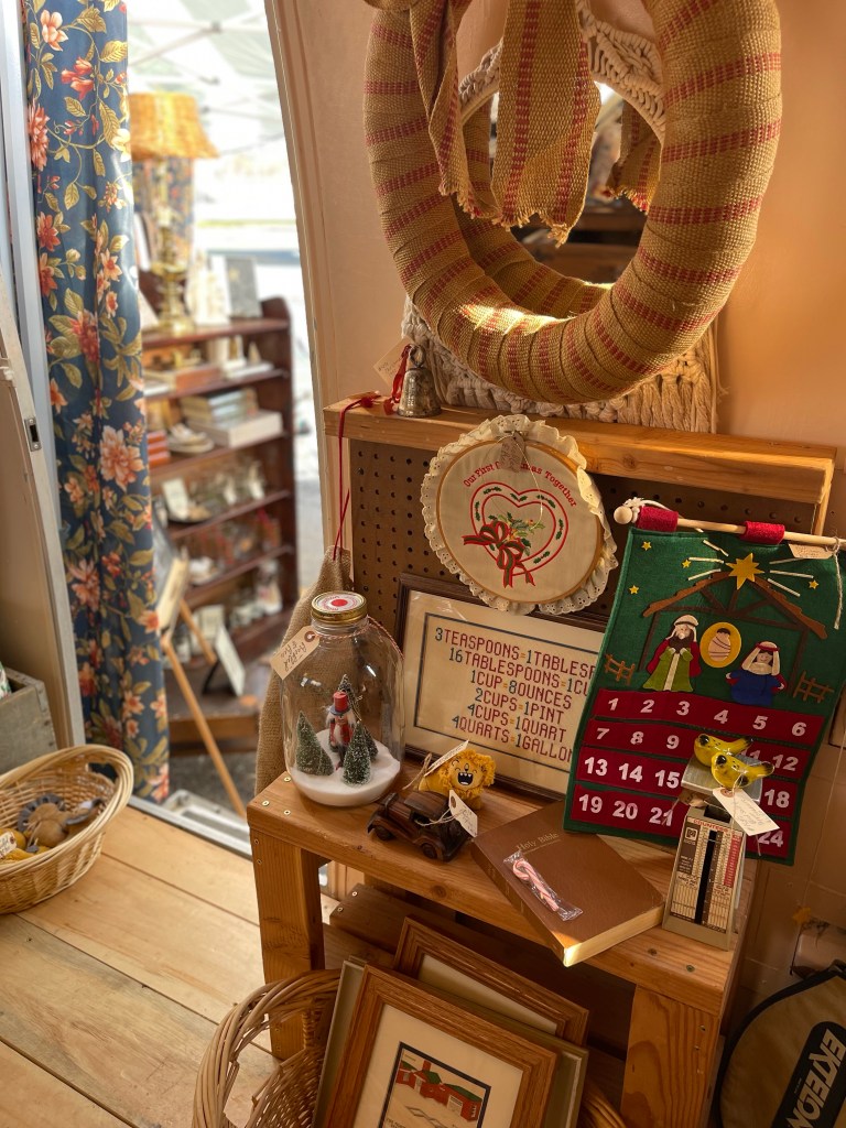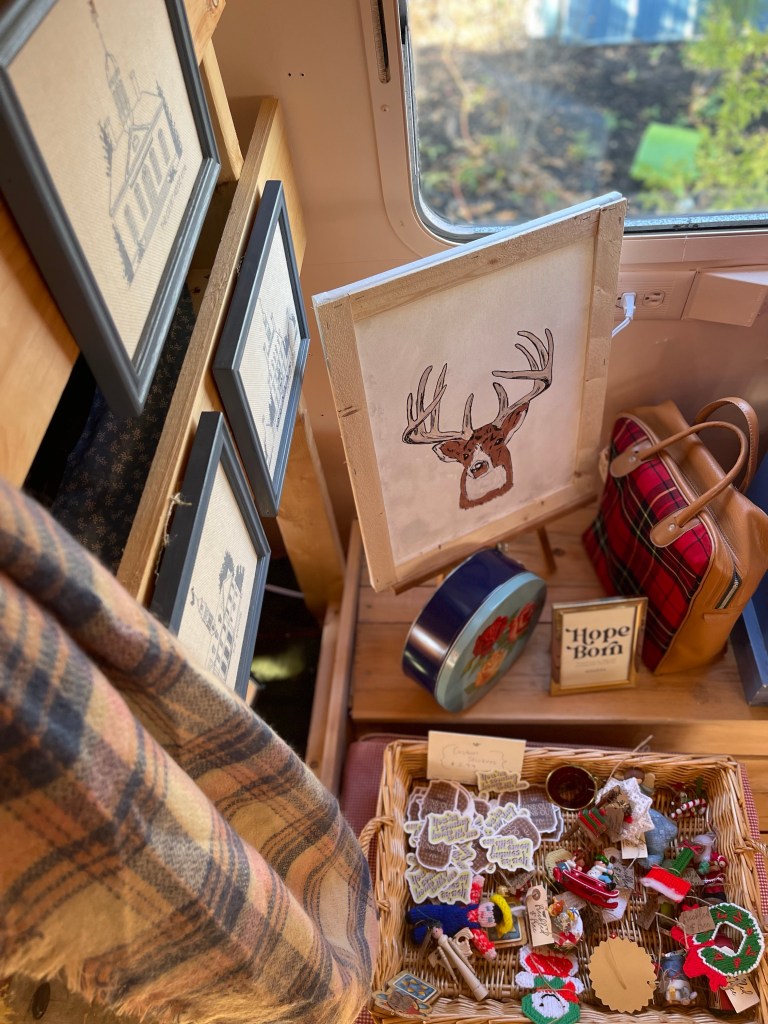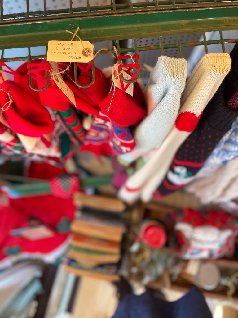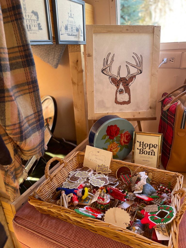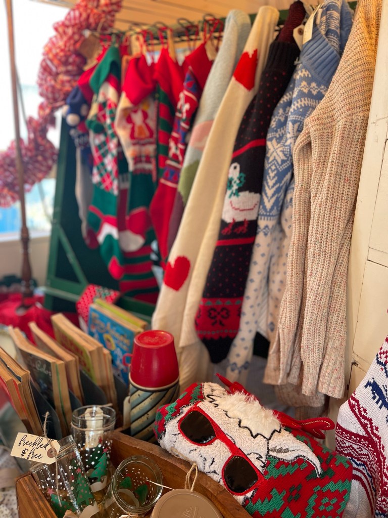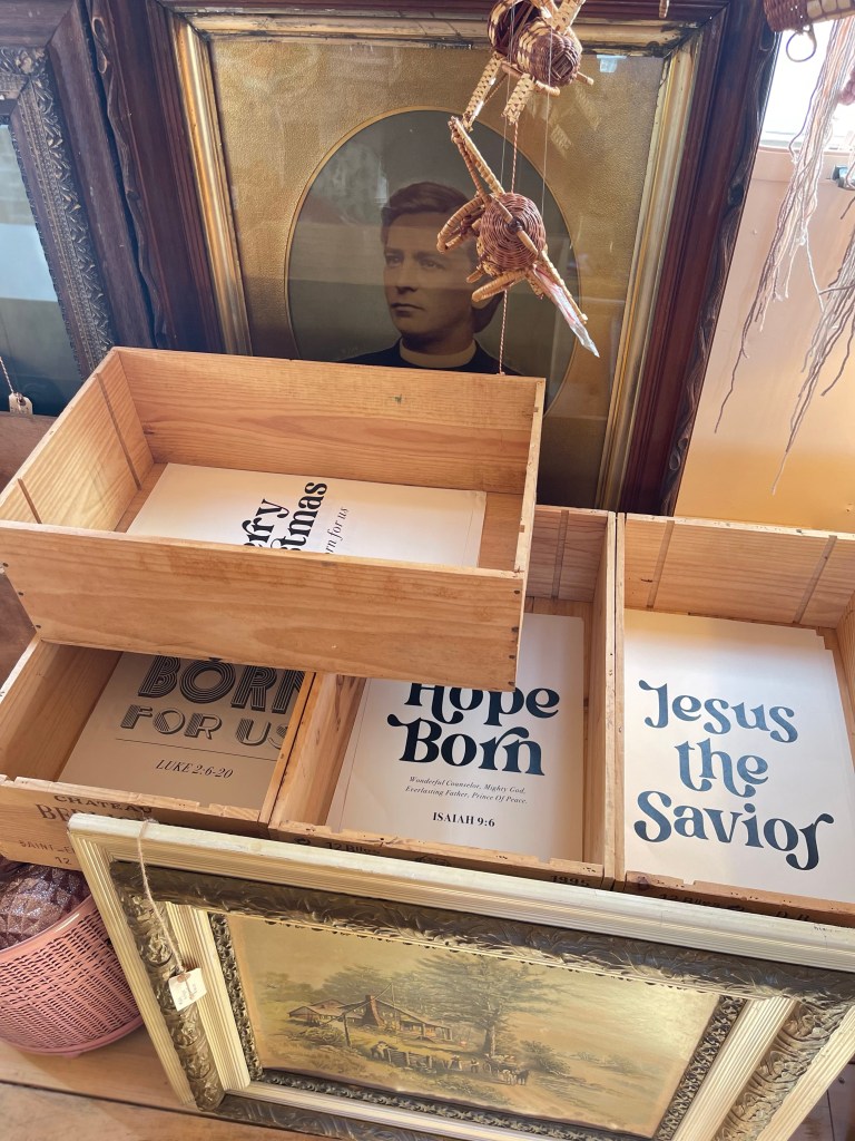 From vintage knitted stockings to an array of Christmas sweaters, something FUN could be found in here. I went with a retro style font choice for the “Hope Born” custom Freckled & Free graphic hung inside the airstream display.