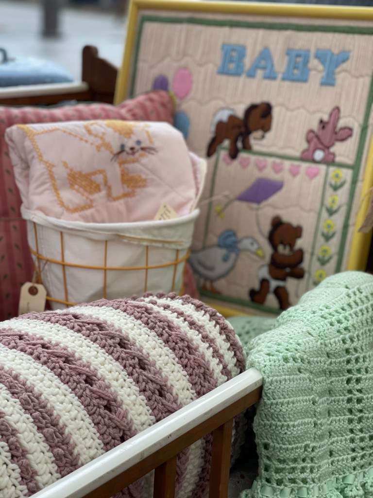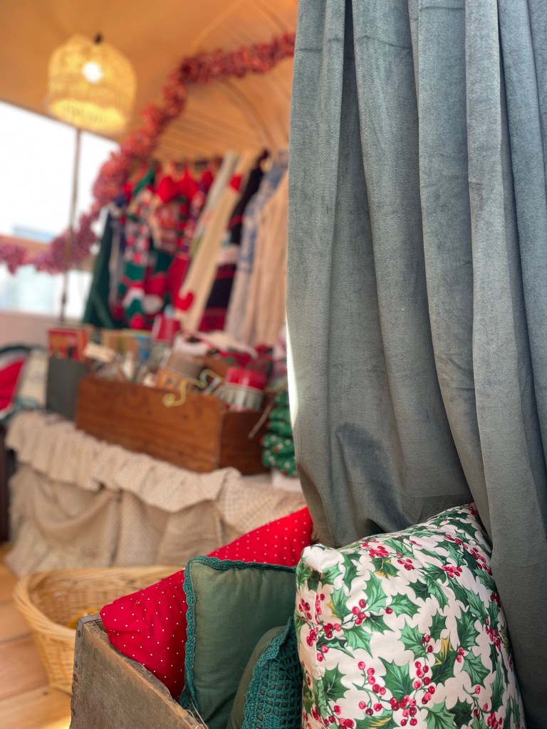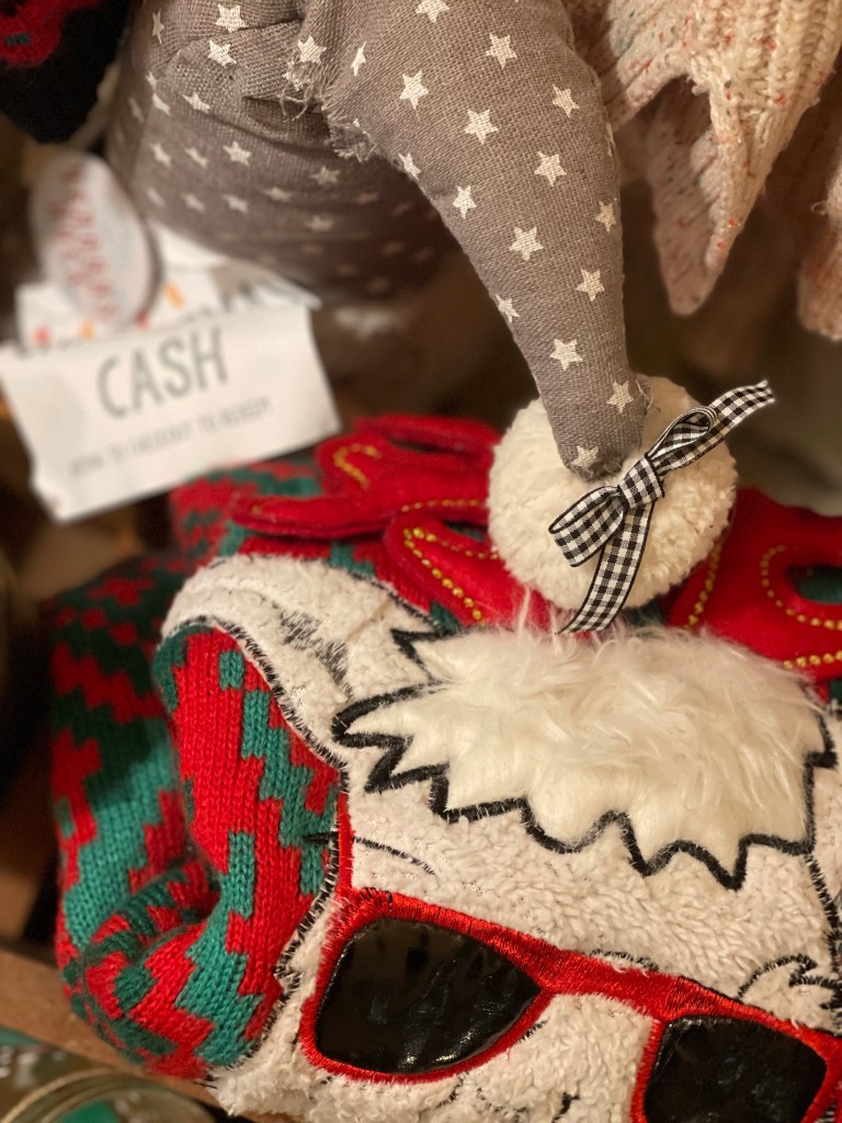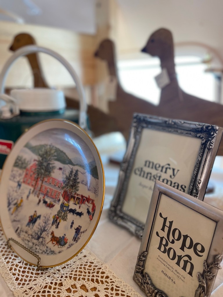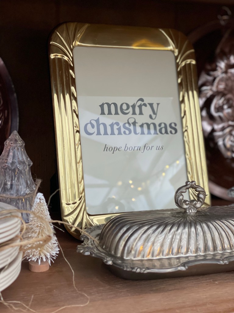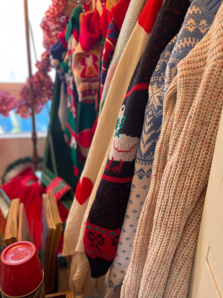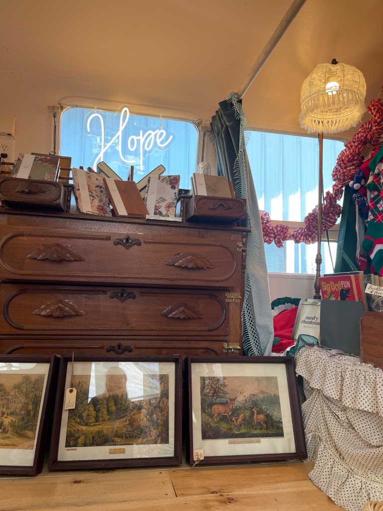 From vintage knitted stockings to an array of Christmas sweaters, something FUN could be found in here. I went with a retro style font choice for the “Hope Born” custom Freckled & Free graphic hung inside the airstream display.