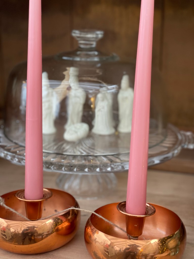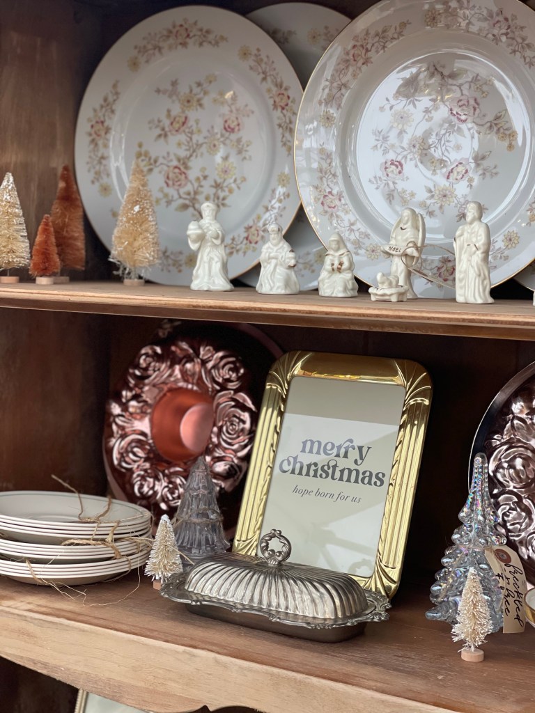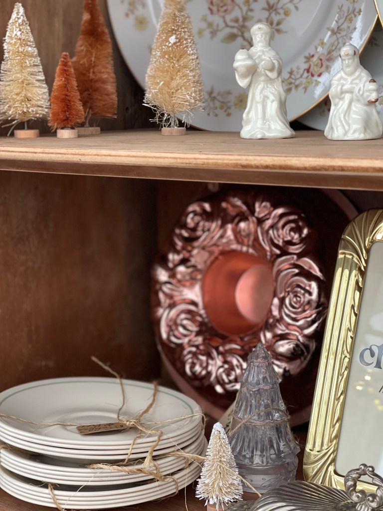 Per usual, I had great fun styling all the pieces. There is something fun about making a pretend world of pretty things. So dreamy and feminine. Rose gold and copper collectibles, floral dining dishes and cream manger scenes dusted with orange and cream bottle brush trees create the perfect elegant Christmas presentation.