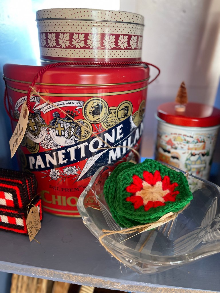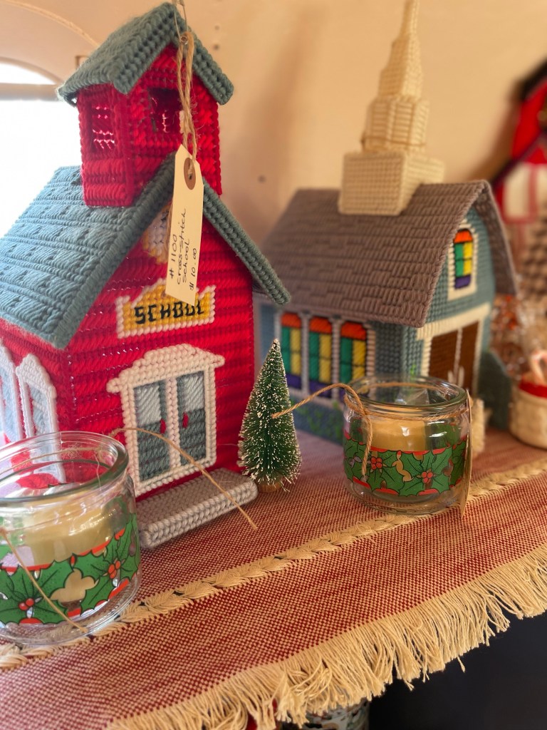 A collected look for the collecter. For the one who loves an eclectic taste. Cross-stitch Christmas towns, vintage Christmas tins, mixed with holly dishes and votives.