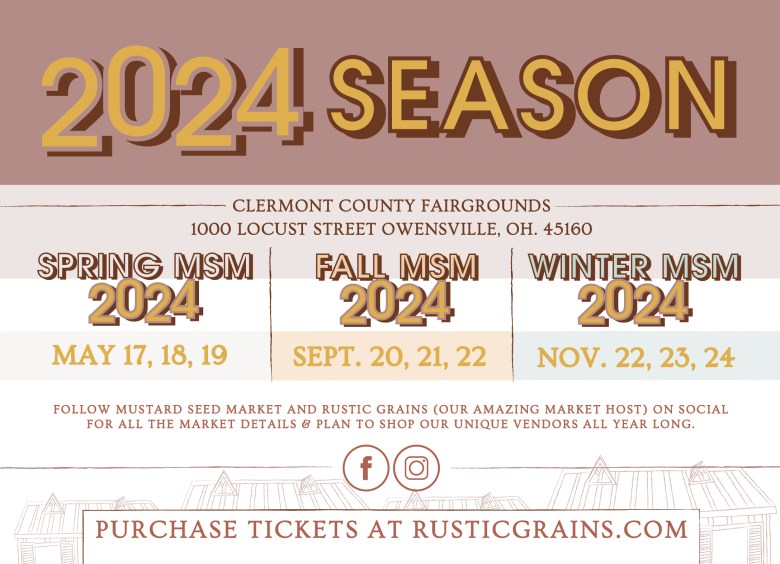 And folks, that’s a wrap on 2023 Mustard Seed Markets. We hope you enjoyed seeing us for all seasons. Make sure to mark your calendars and plan to join all three markets again for 2024. Happening this Spring, (May 17, 18, 19), Fall, (September 20, 21, 22) and Winter, (November 22, 23, 24). For more information go to www.rusticgrains.com, our great creator and host of the market.