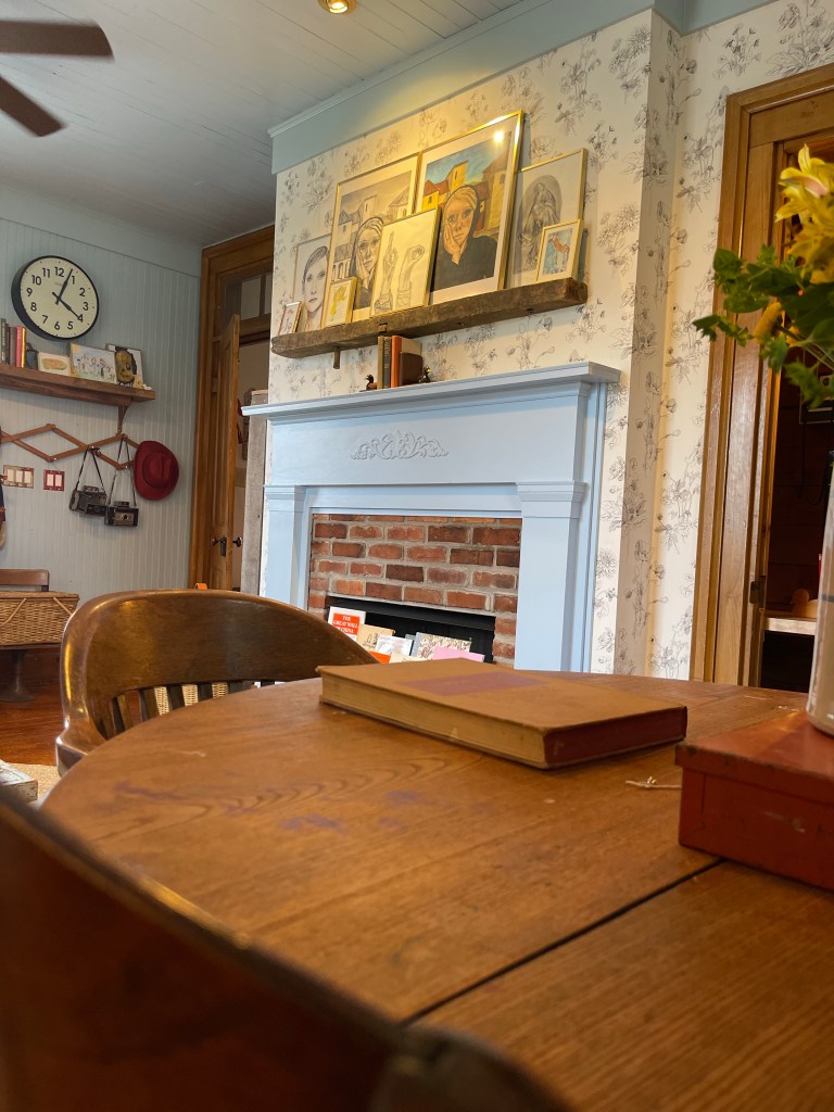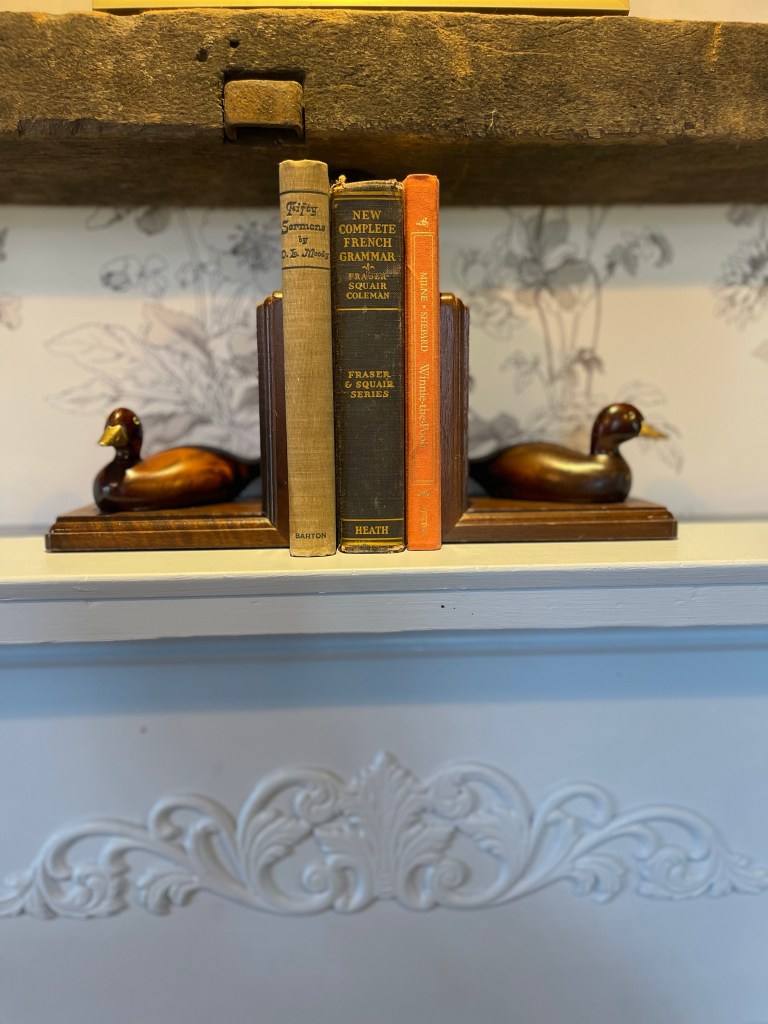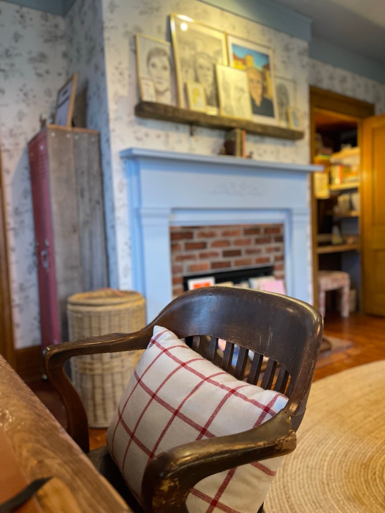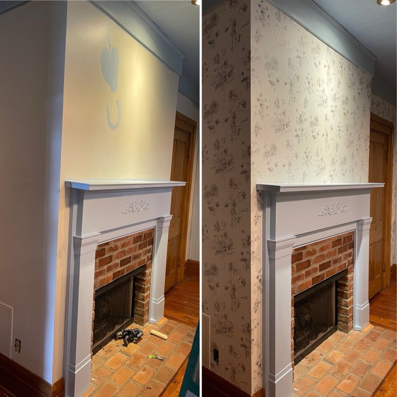Felt so fitting for our 1955 home. In addition we had added the wooden scroll to the fireplace and painted it the new color. We decided to keep the gorgeous original brick and I’m glad we did.