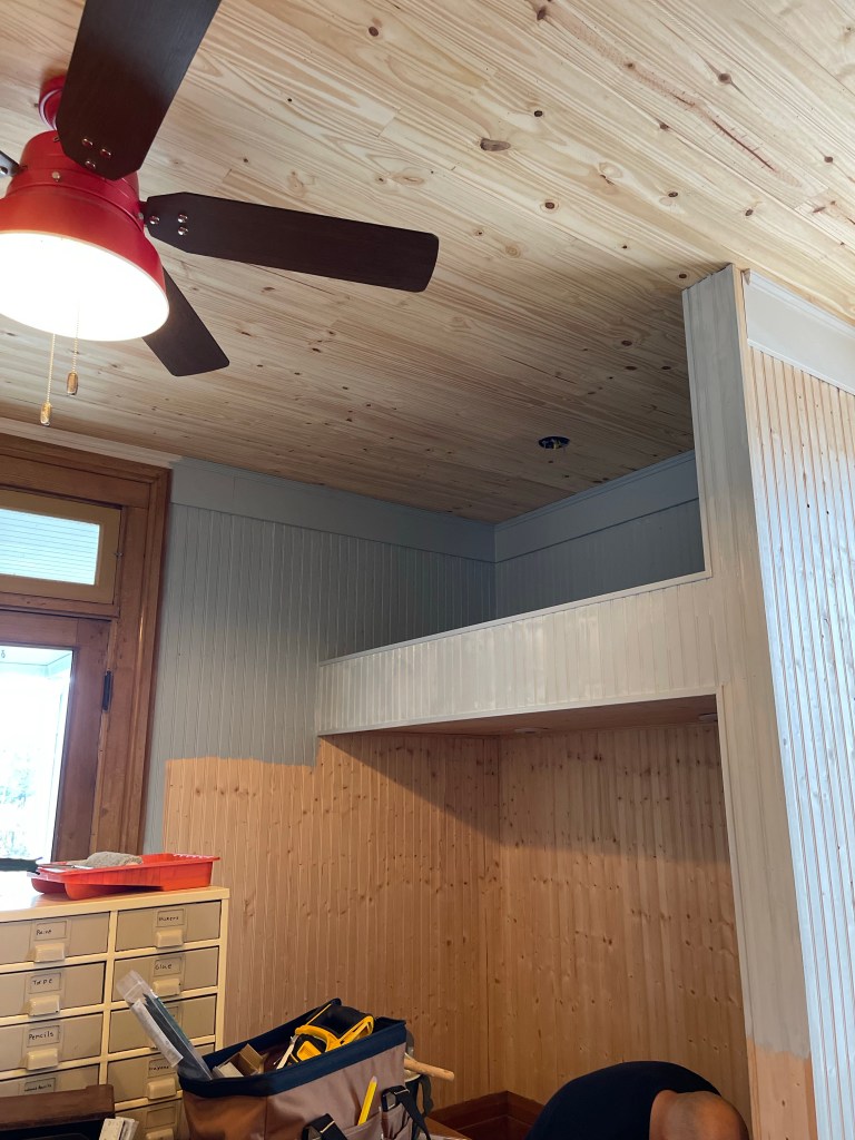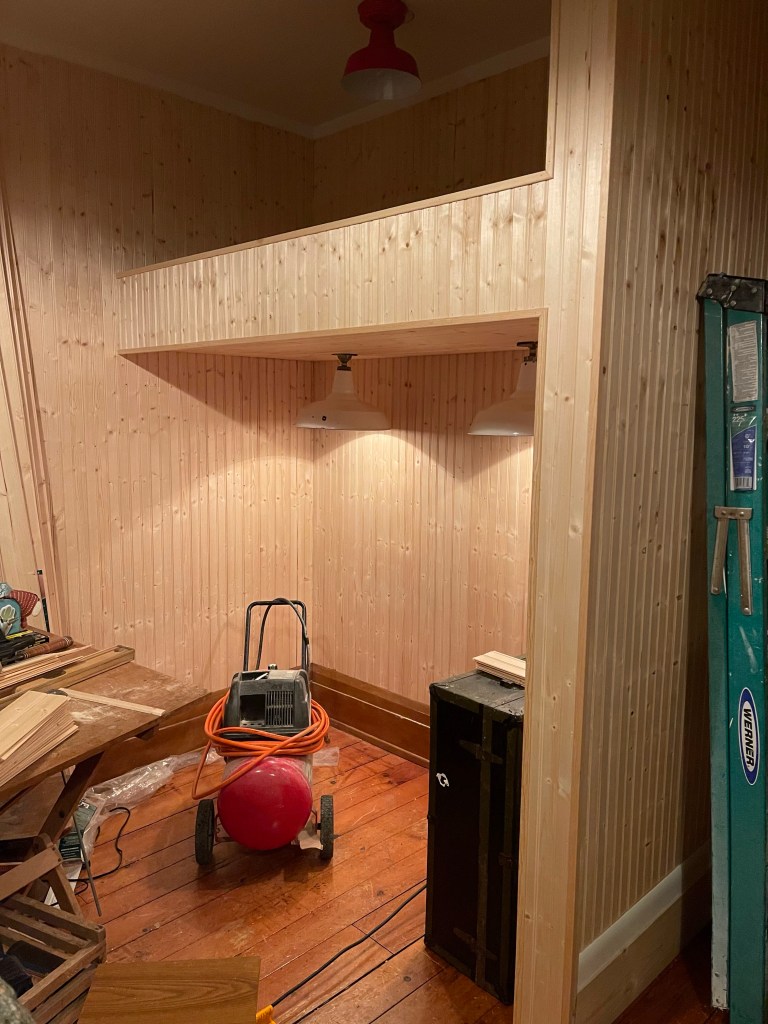 When that was mostly done, Tom was a very happy boy and proud of what he learned to do. From the wainscoting on the walls and bunk space, to the v-groove we chose for the ceiling, as well as the custom trim work, all went a long way to beef up the space even more.