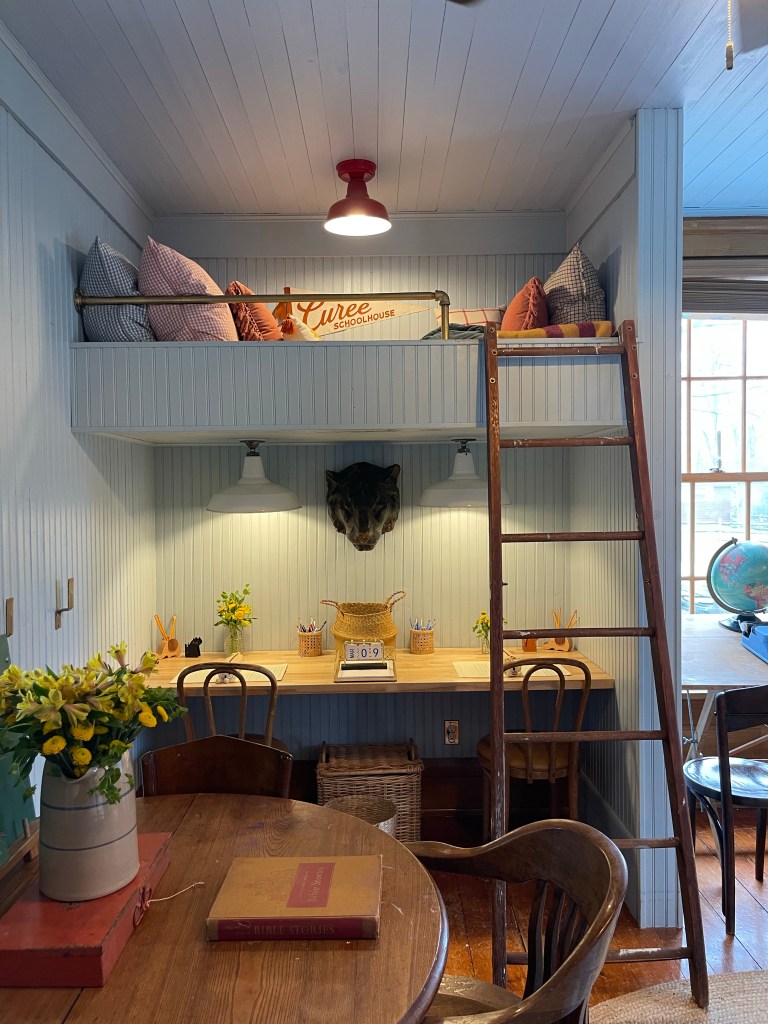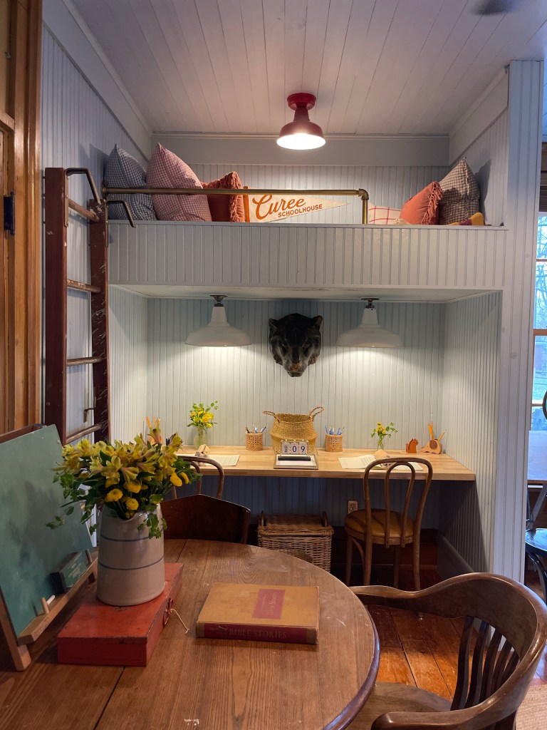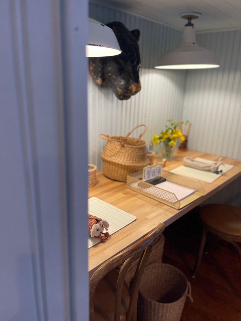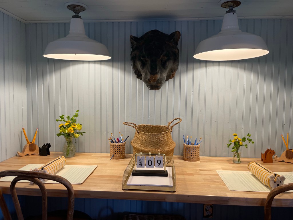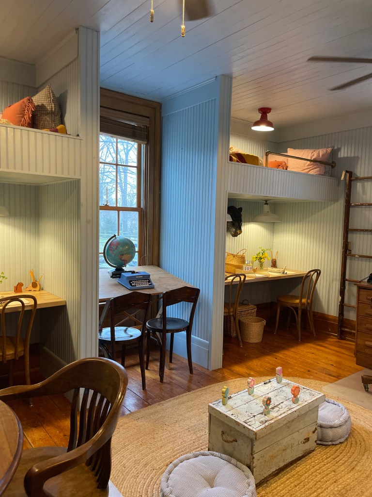 We did try to create some privacy with the split spaces. But snuck in any additional work spaces where we could. If you have ever homeschooled, or have kids for that factor, you know some days they just need space from each other. I couldn’t believe how well my antique adjustable art desk fit in front of the window. Needless to say, they had options to move if needed.
