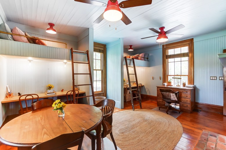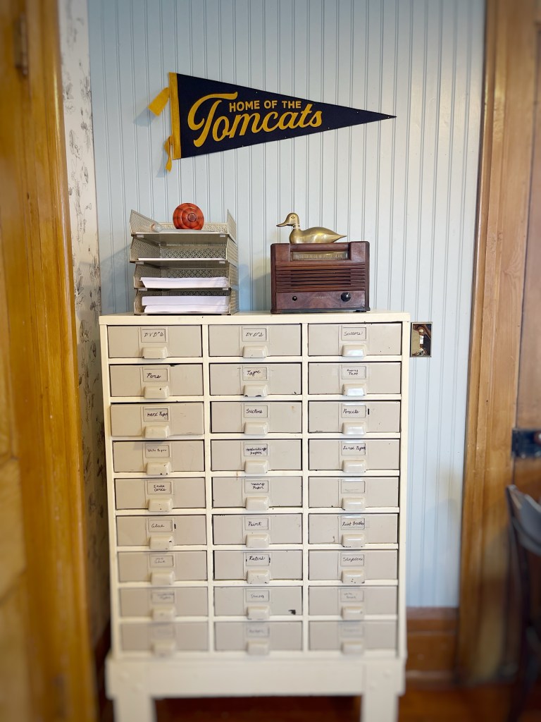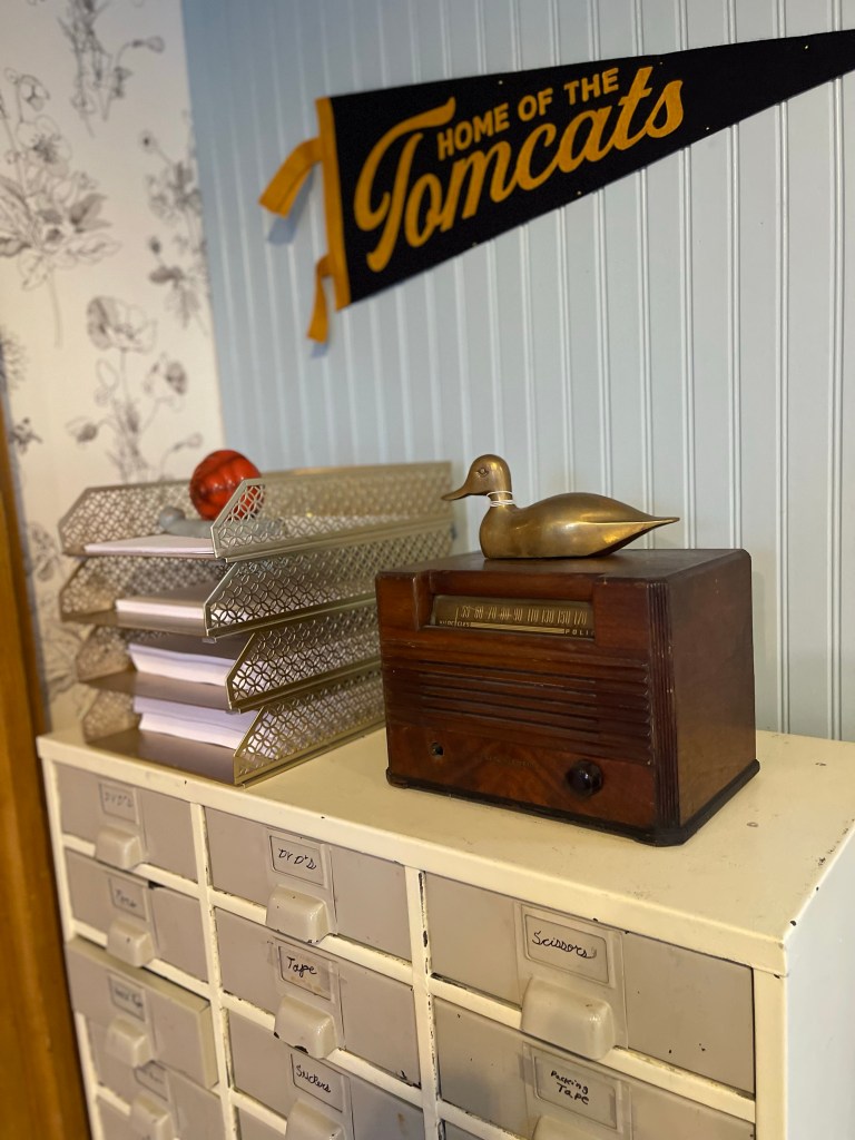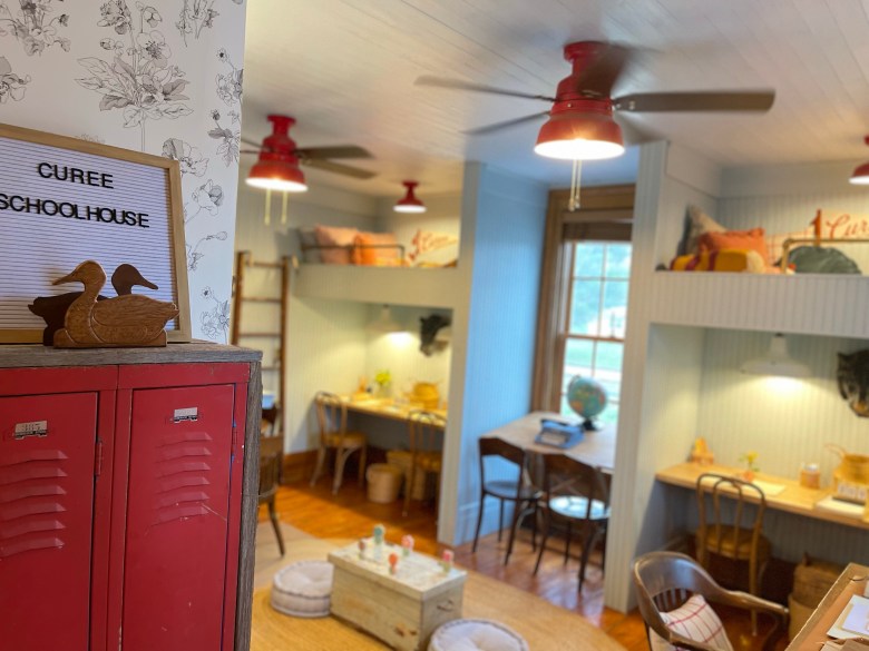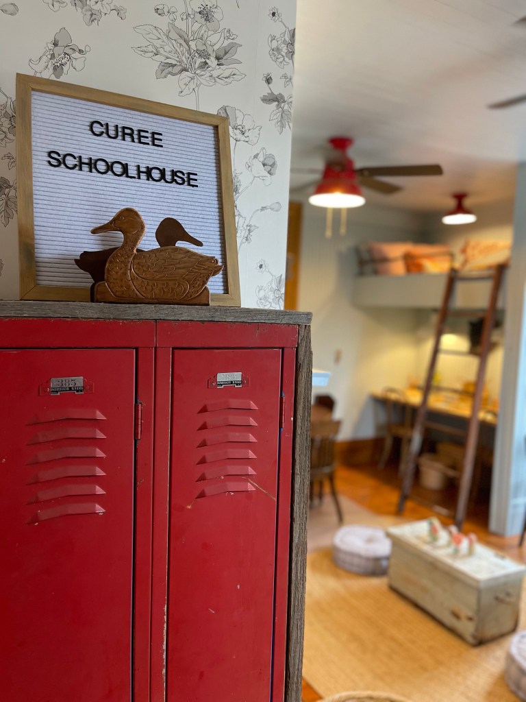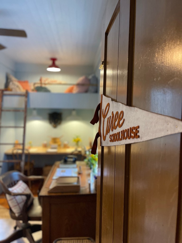 Purrfect right (ahem…dad’s name is Tom)!? We were geeking out at this clever idea. I even had custom pendants made to represent our Curee Schoolhouse well from FellowFlagCo on Esty. They did a fantastic job executing my vision. I had two different custom pendants created, Home of the Tomcats and 3 Curee Schoolhouse pendants, one for each bunk and one for the door entering into the homeschool room of our house.