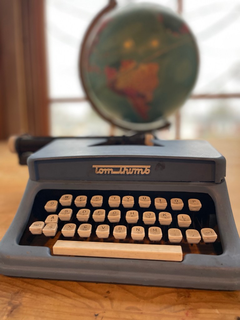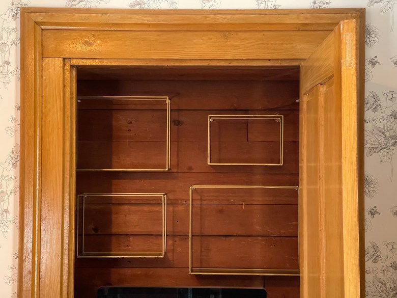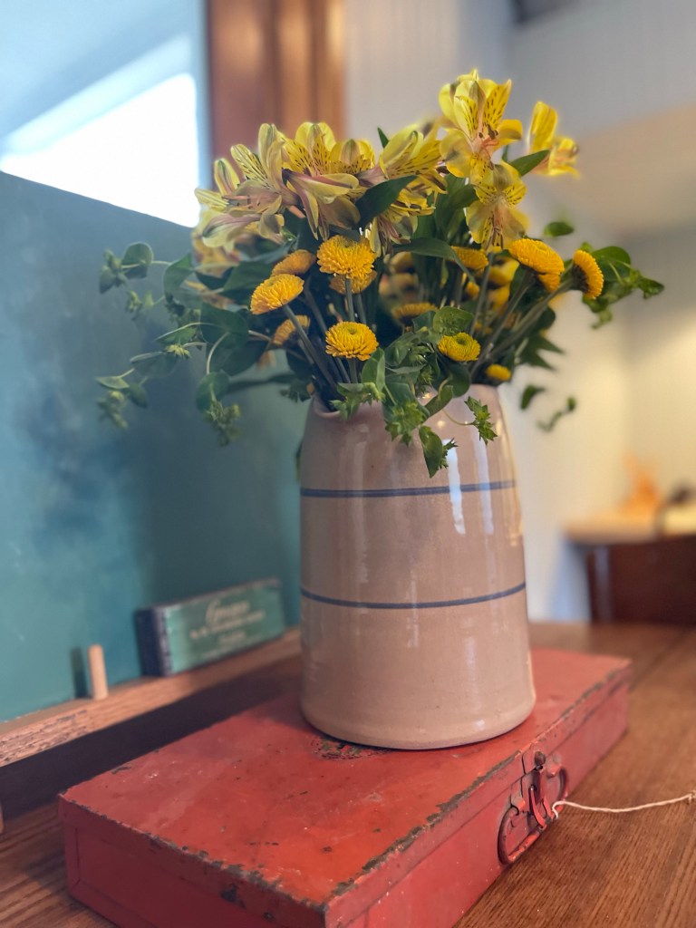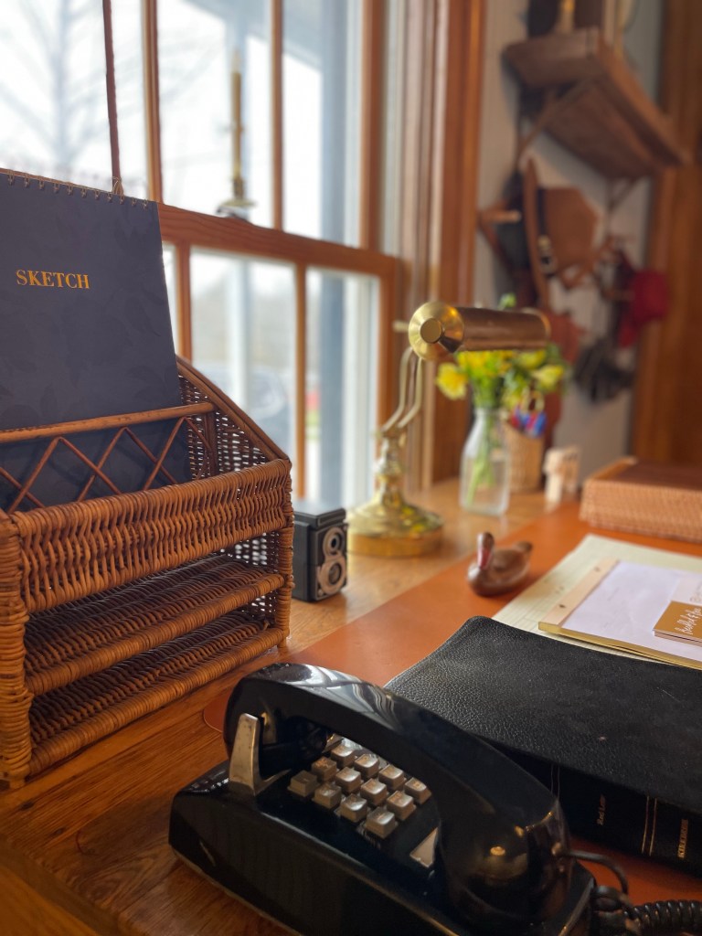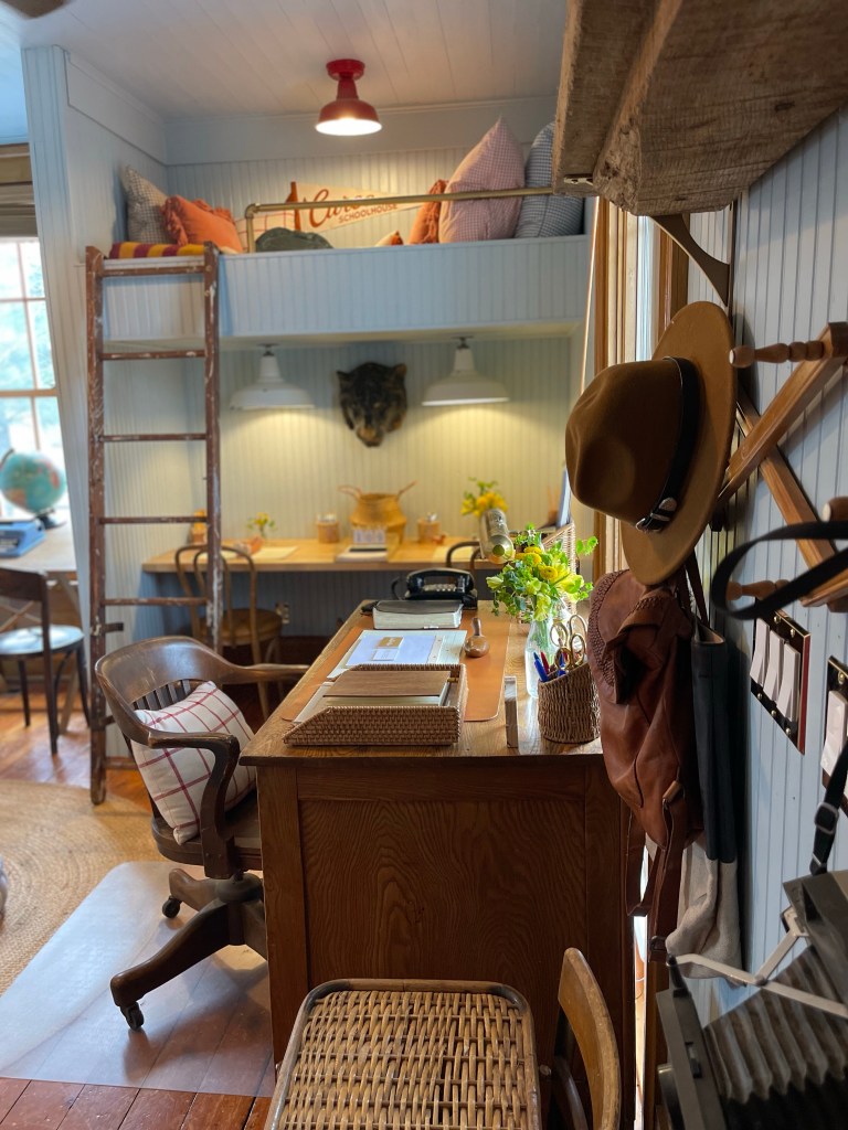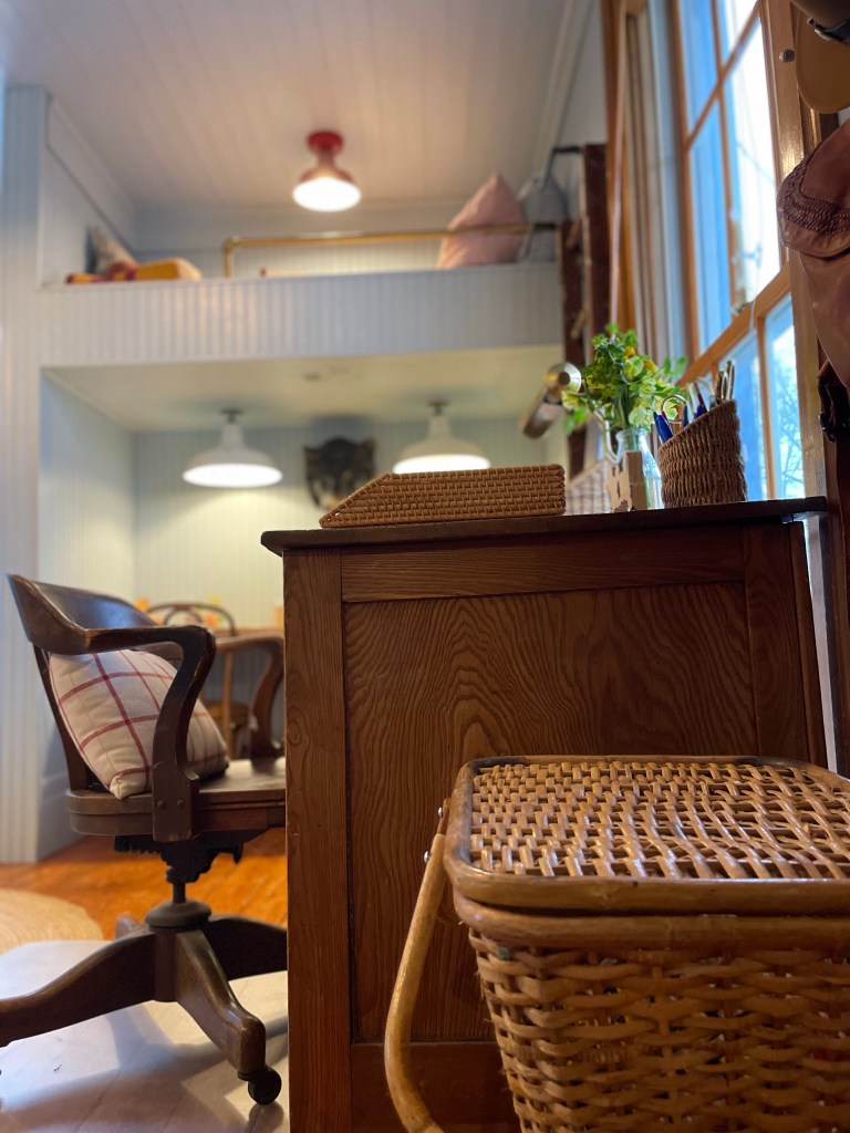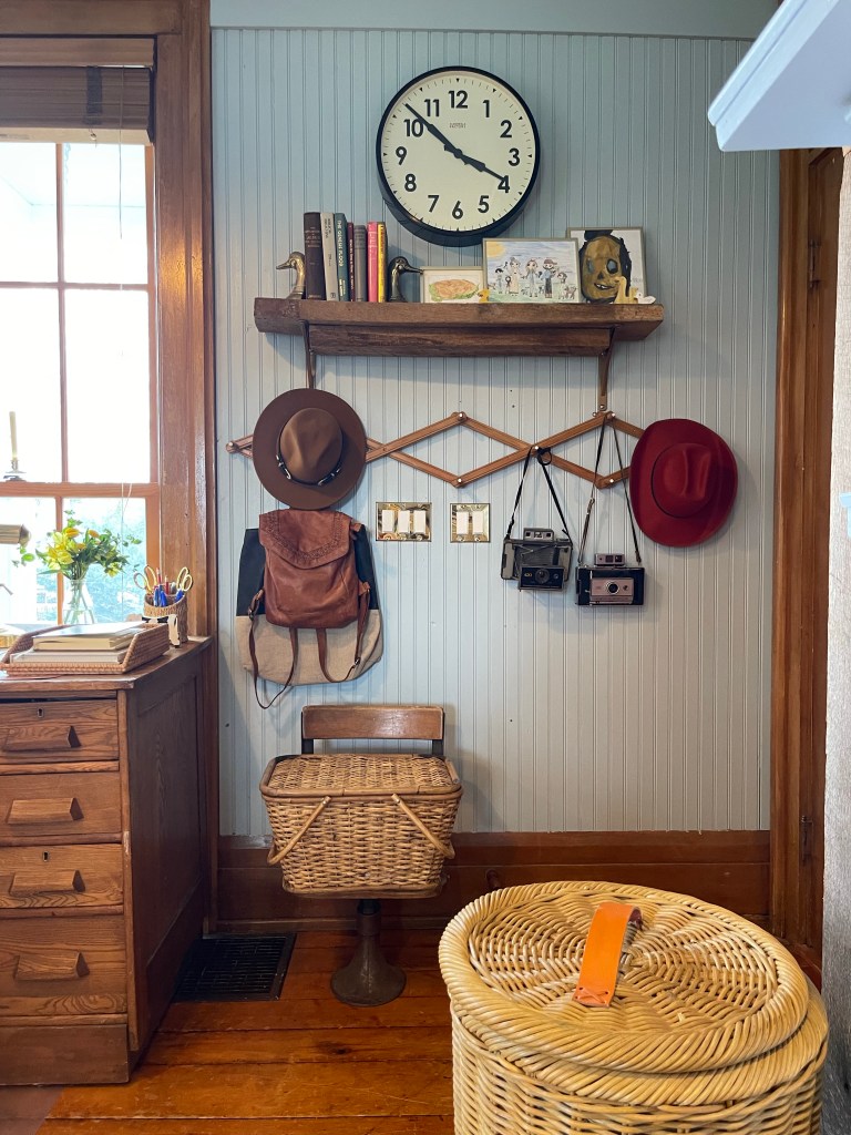 Vintage accordion racks are always a must. Baskets galore—and organization that works. Vintage phone for play and fun.
