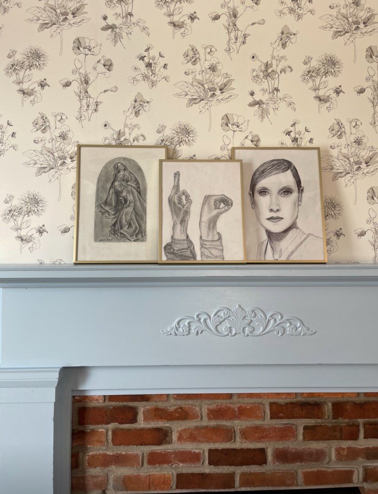 For the wallpaper wall, I planned to a put a combination of my artwork and the kiddos artwork on display as a gallery wall. Co-exisiting together. A beautiful way to debut all of our talents. I had several potential wallpaper choices I could have gone with. In the end, I decided to go with the most calming choice. Meadow Bloom wallpaper by Anthropologie.