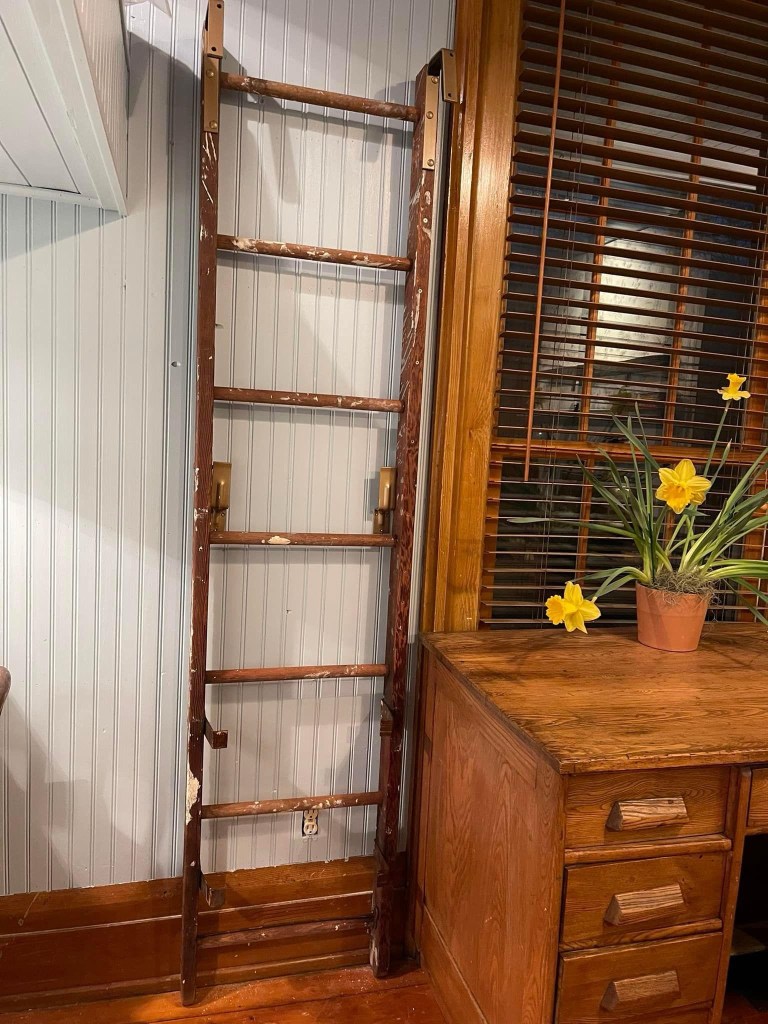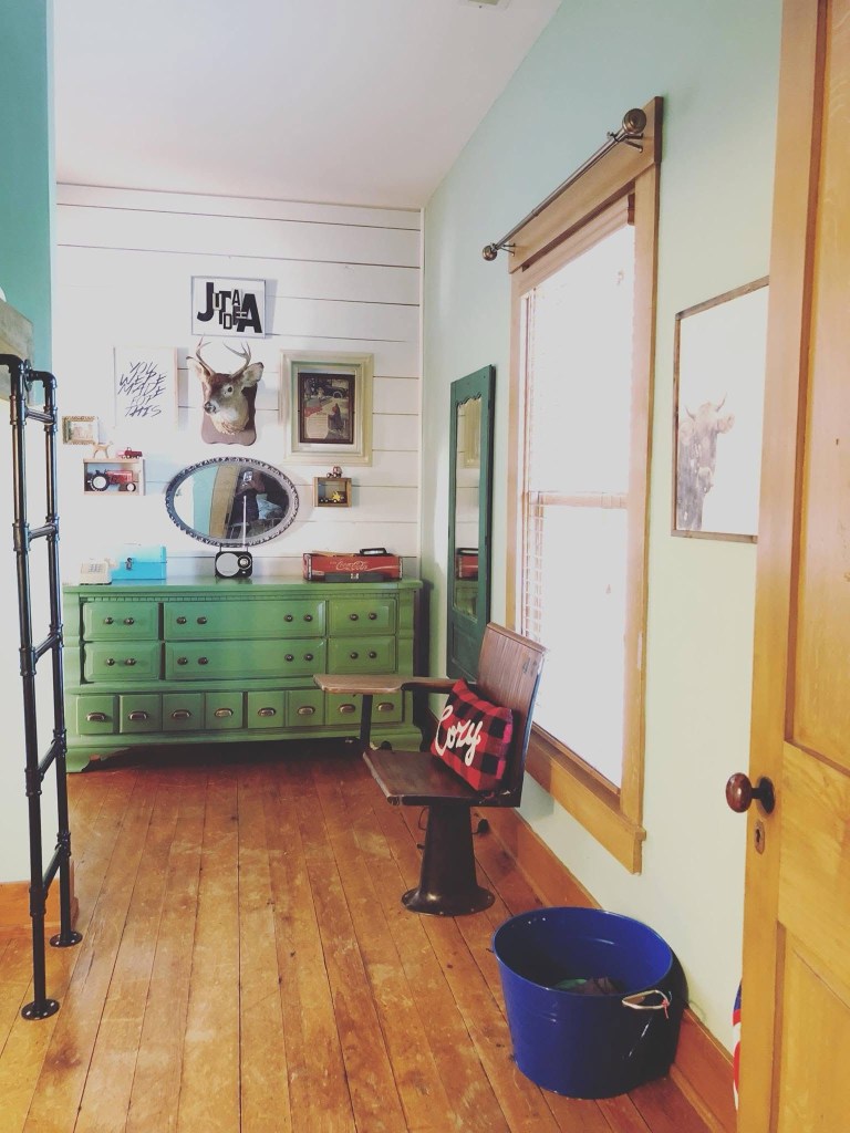 This time however Tom got the idea to find old antique ladders and repurpose them. We watched marketplace for awhile, found one long enough to cut in half so we had one for each bunk. Then he cleverly made custom hooks to hang onto the bunk or when we needed extra space by their desk the ladders could then mount and hang on the wall. Antique ladders to us, are artwork in themselves. So whether they were hung off the bunk or displayed on the wall, they turned out beautifully.
