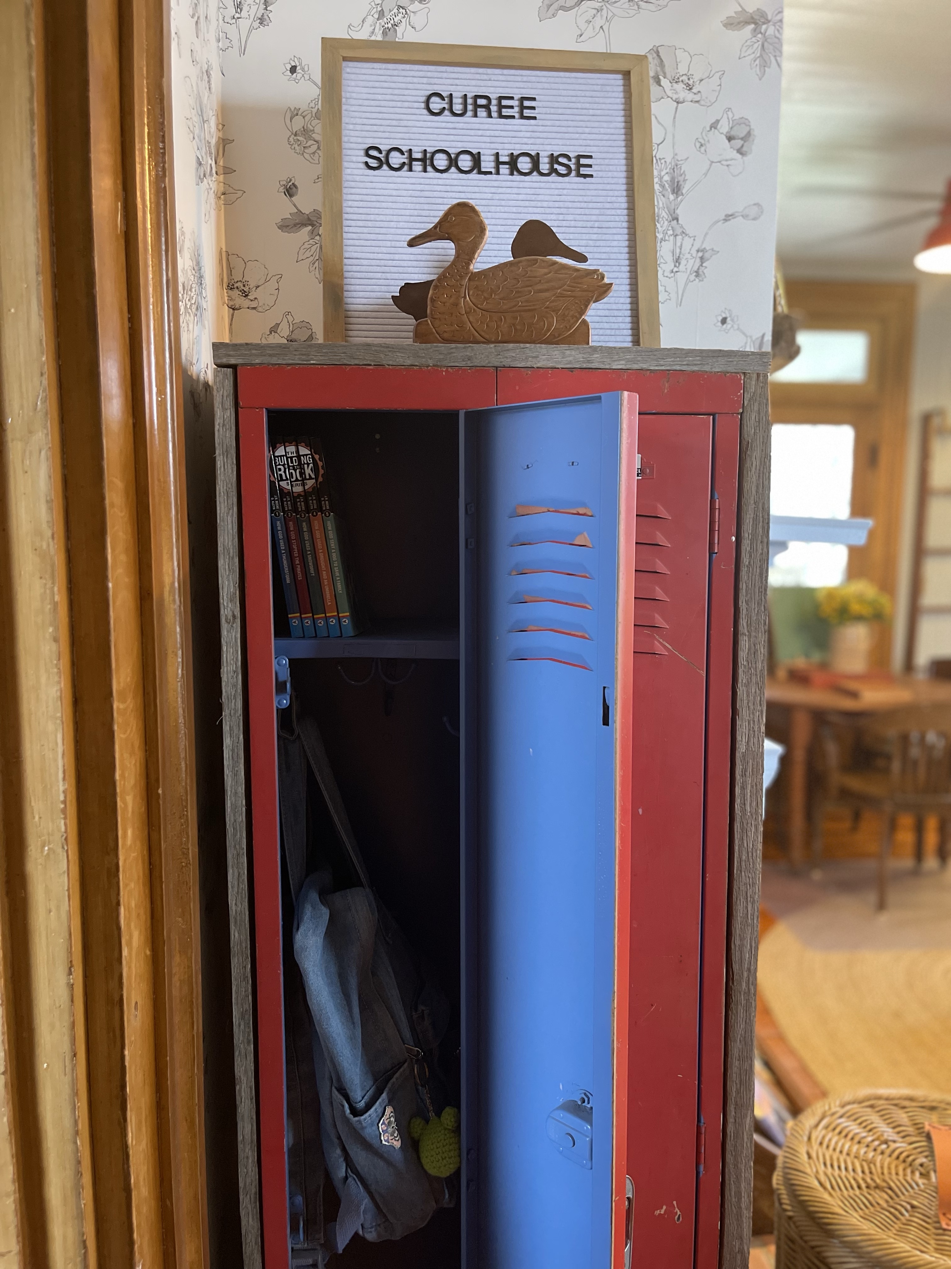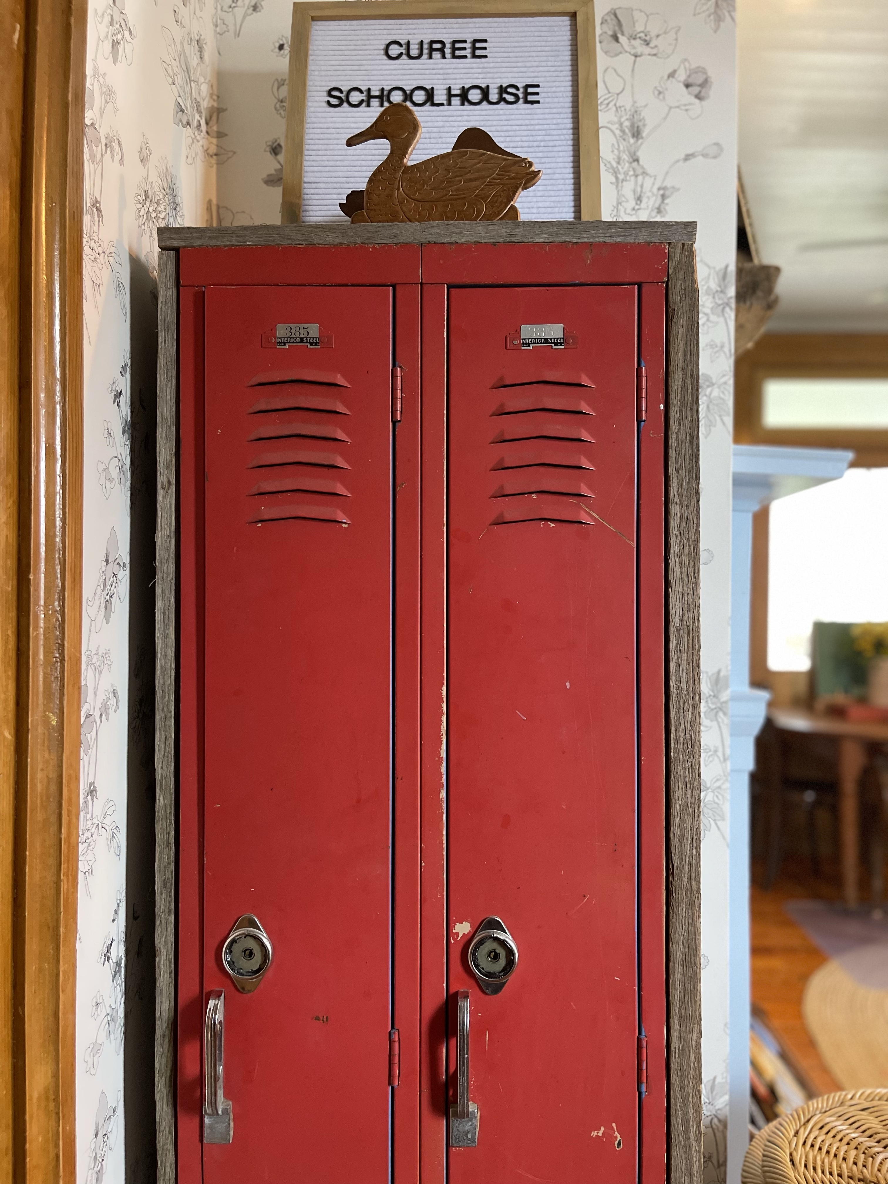 Tom and I were so stoked when we found some of the original school lockers from our local school district for sale that we actually used when we were students there. It was a no brainer that we had to utilize them in this room and save a piece of local history for our kiddos to enjoy as well. They needed a little cleaning up, so I had Tom frame them out with more of the barn wood and we refreshed the inside with a clean coat of blue paint for another interesting detail.