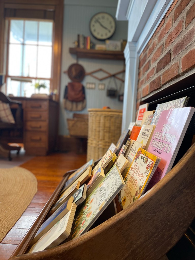 In a similar shot we see how in the center of the room I staged it with a distressed antique trunk with sitting pillows for book basket time. With the removal of the couch, it allowed for an open loungy, adjustable space that gave us some wiggle room to move around easily depending on what we were working on that day. The distressed trunk was one of our first antiquing picks when Tom and I were first married from Logan Antique Mall and we scored the amazing wooden vintage book rack display in front of the fireplace from our Round Top, Texas trip. Pieces woven in that tell a story and share our travels.