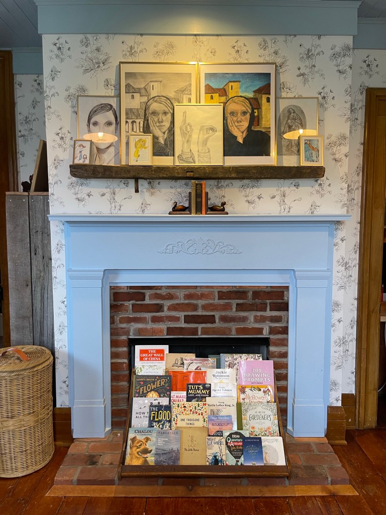 Mixed in with our collections, a large vintage looking clock from Magnolia and one amazing piece of wood from a 100+ year old barn we repurposed into a shelf simply by adding brackets. The wood contained all the beauty just as it was and held up this gallery space.