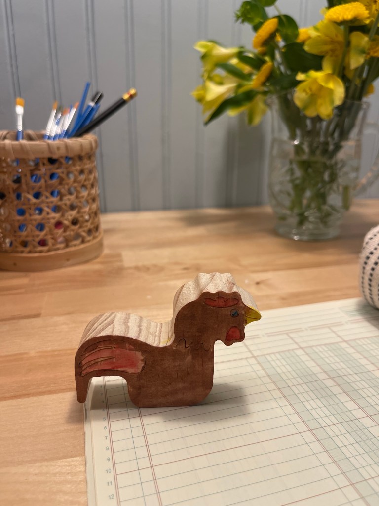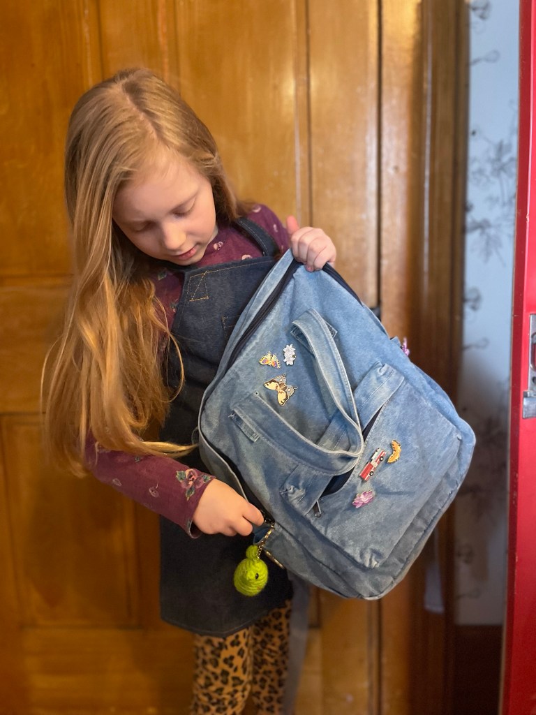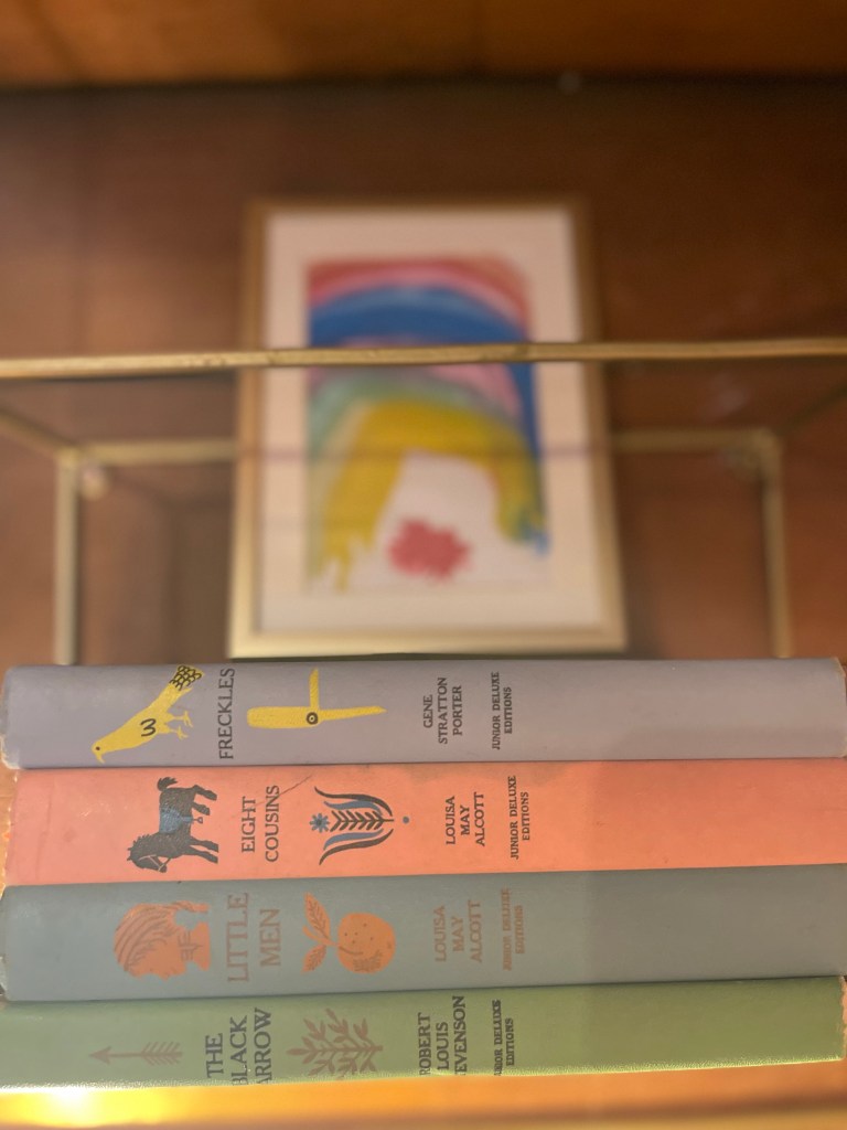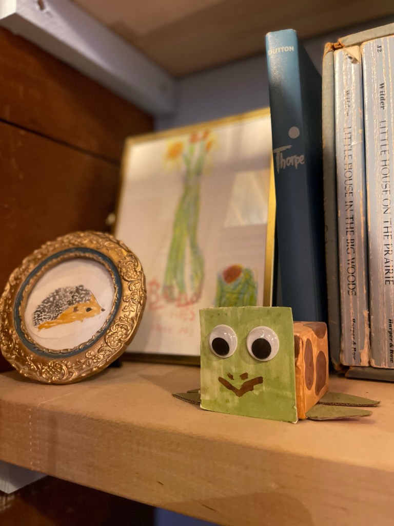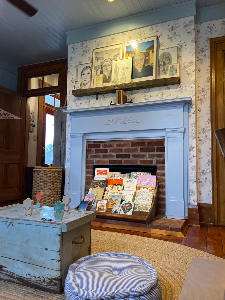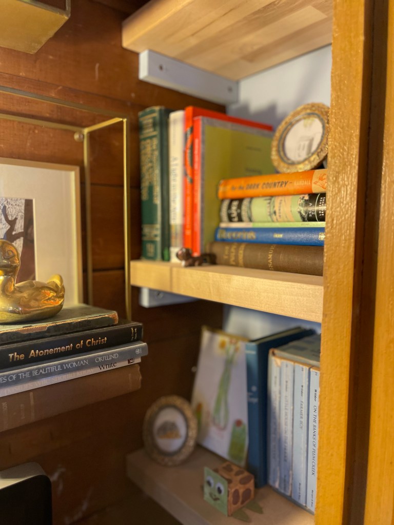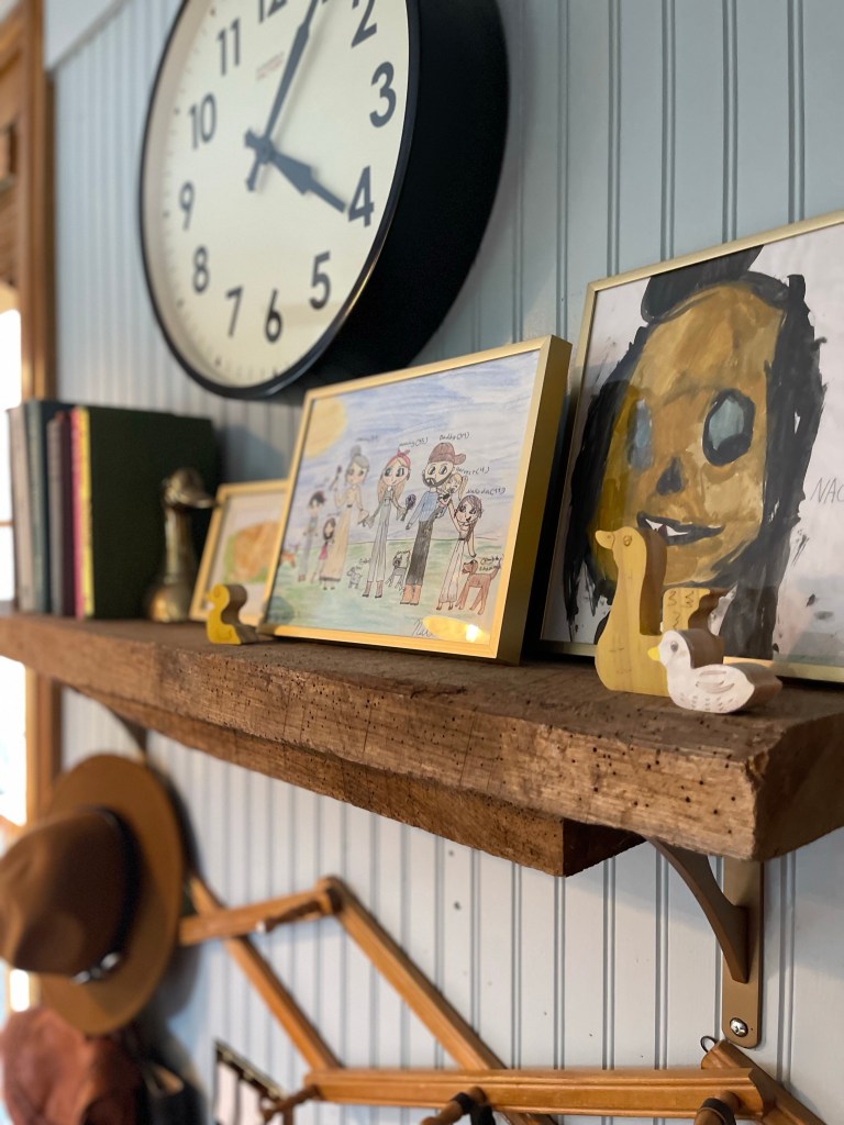 Including this closet—which was the only closet on the first floor. With charm, we made her the perfect spot for our tucked away computer space and storage for all the homeschool work that isn’t necessarily pretty for display. Working to mix in the kiddos endearing, comical, free at heart, playful and adorable pieces. Having that one dedicated place in the house for the master pieces to be on showcase like they deserve. Adding this thrifted stool which fit perfectly in the space with the ability to slide under or out.