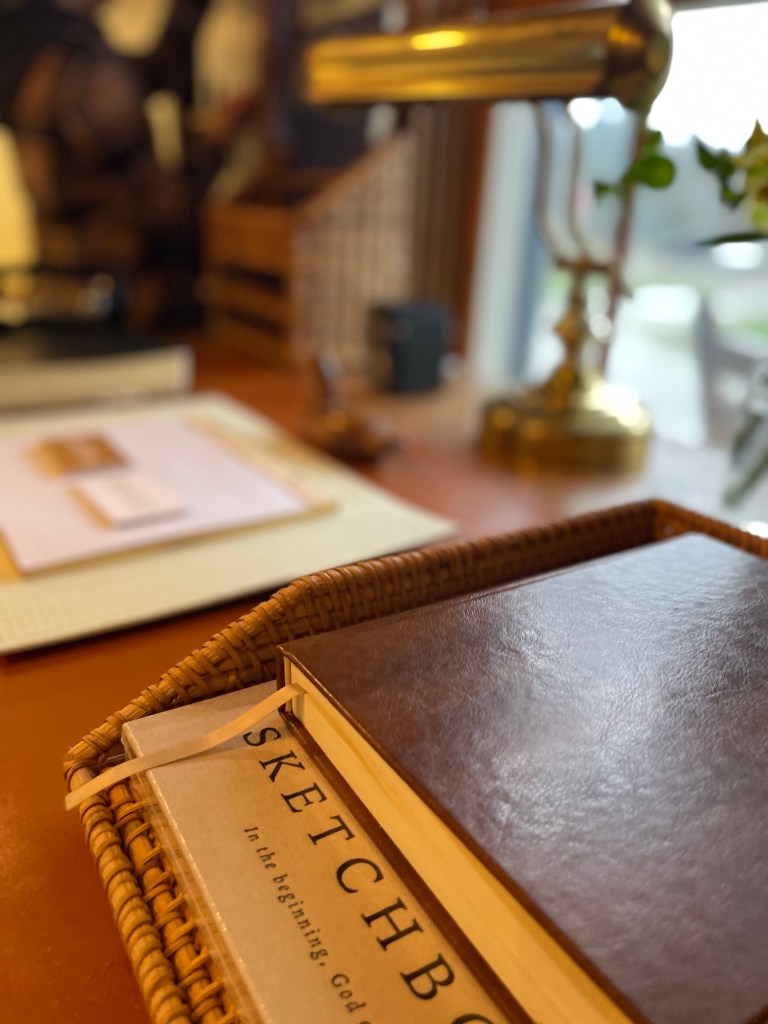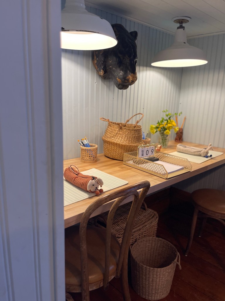 For their desk, each of my four kiddos had their own half of the space. Adorable desk organization, rattan pencil holders, baskets for all their craft items. Brass desk top file holders for paper storage or worksheets and their own perpetual calendar.