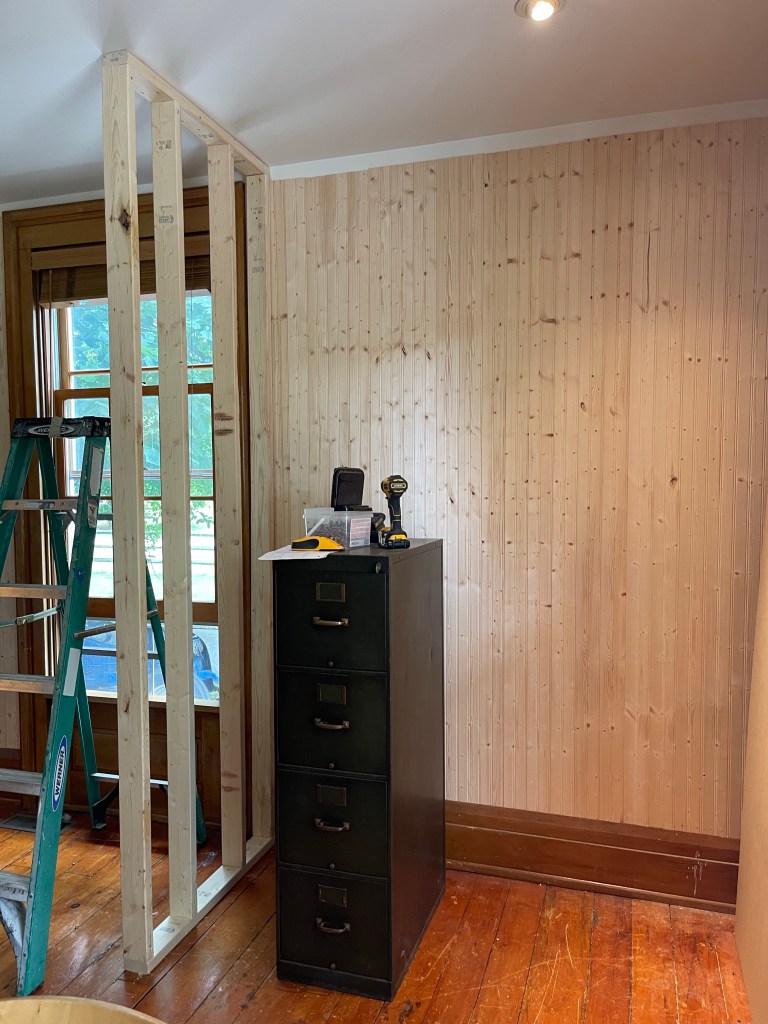 With the space being 90% complete, because if you know me, I had a few more projects I wanted to implement in the space. I had everything needed for Tom to create four custom foam boards for each of their work spaces that I had chosen adorable fabric to cover them in. A space they could customize and switch up as they wished. Tacking all their favorite pieces or photographs they collected. I also had a white board I’d been saving that was waiting to be framed out and hung on the back of the homeschool room door for spelling practice. I already had the trim and all. But that didn’t get to happen. Two things that we never got to finish that was a part of the original plan and would have completed the last missing functional pieces we needed.
