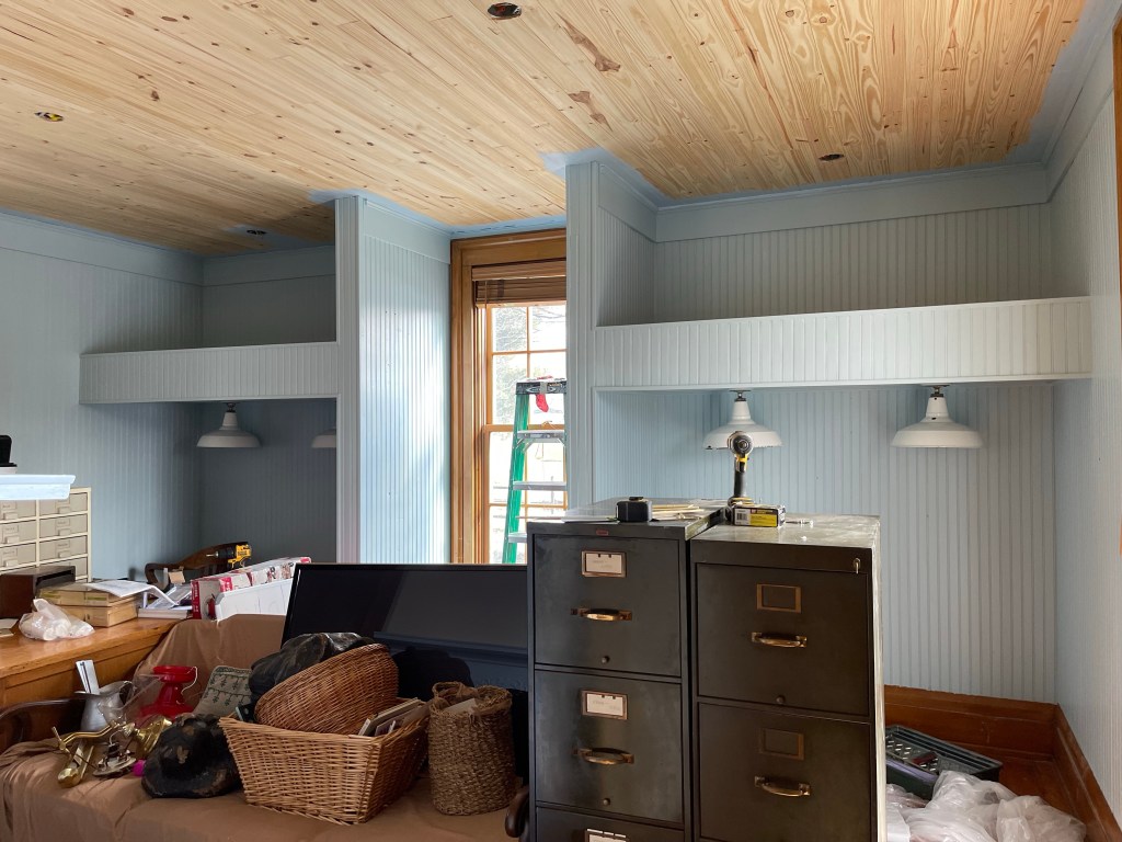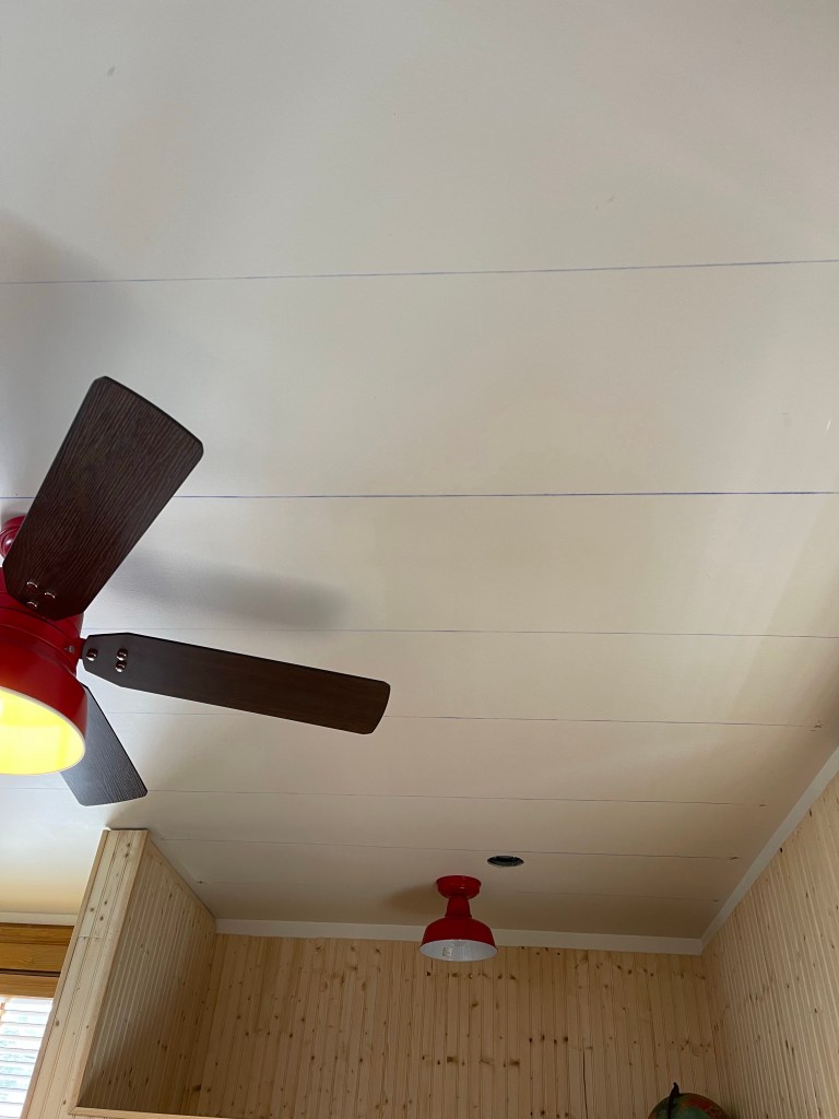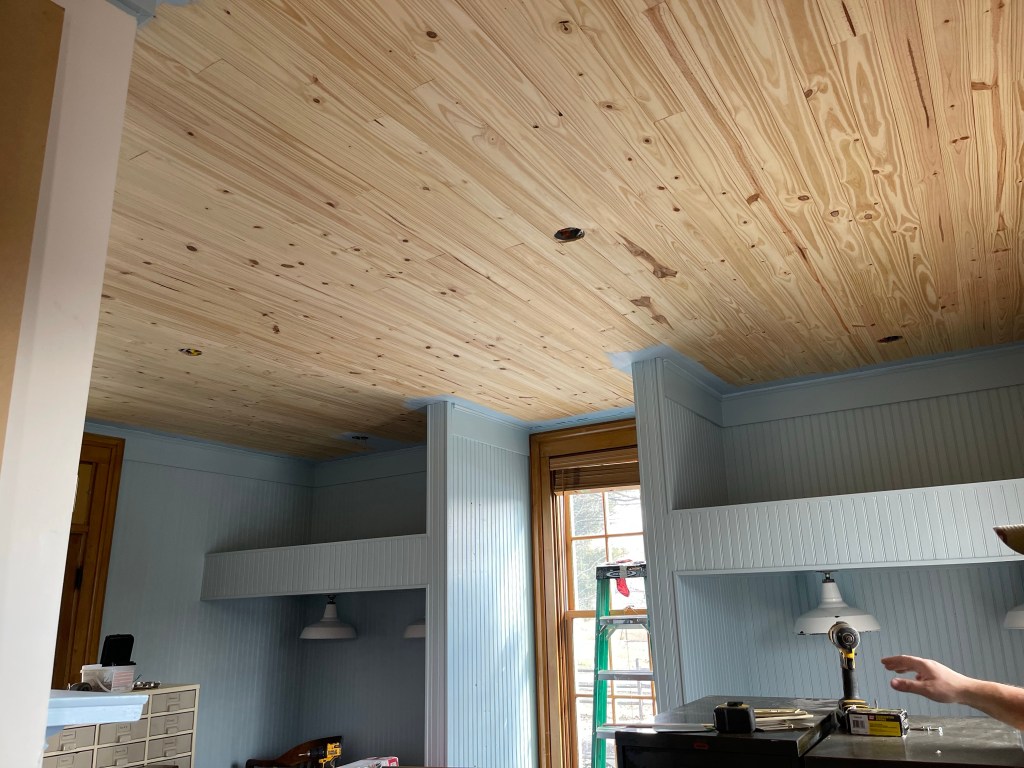 Tom chalk lined the ceiling for a map of where all the studs in the ceiling were for mounting the v-groove.