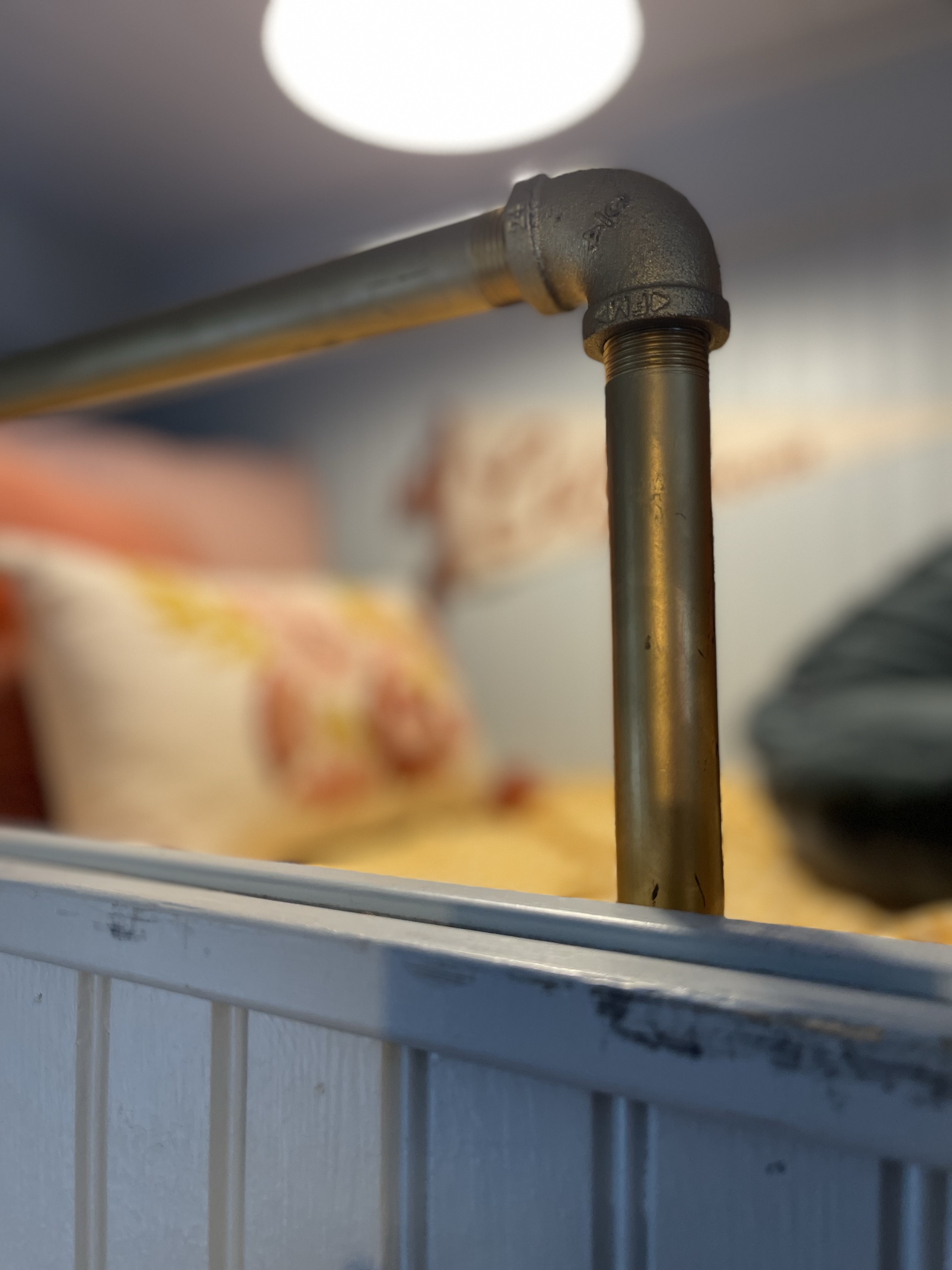 We finished up the bunks by adding the safety railing that we made out of painted galvanized pipe. Good news this space could now also double as a great space when the kiddos had sleepovers as the bunks were created a hair smaller than a twin bed and made great sleeping quarters.