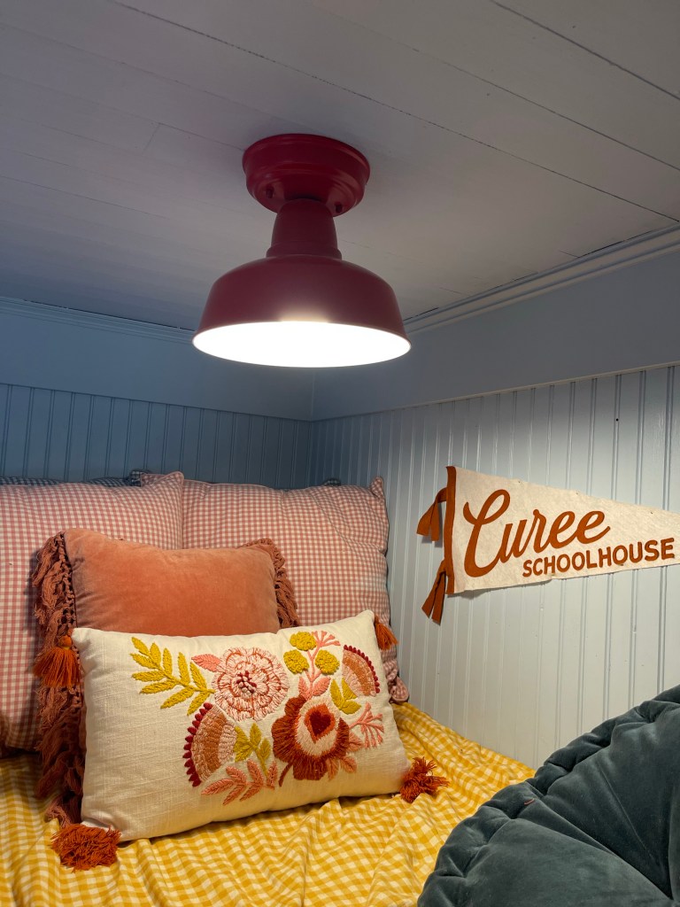 For the bunk nook lighting we chose a simple urban barn farmhouse industrial ceiling light in metal red, now sold out on Amazon. They still have them in black here. I loved the color in the space. If I had to redo it, I would have chosen a smaller light, maybe even flat against the ceiling as the kiddos constantly hit their head or backs on it. Lesson learned for next time.