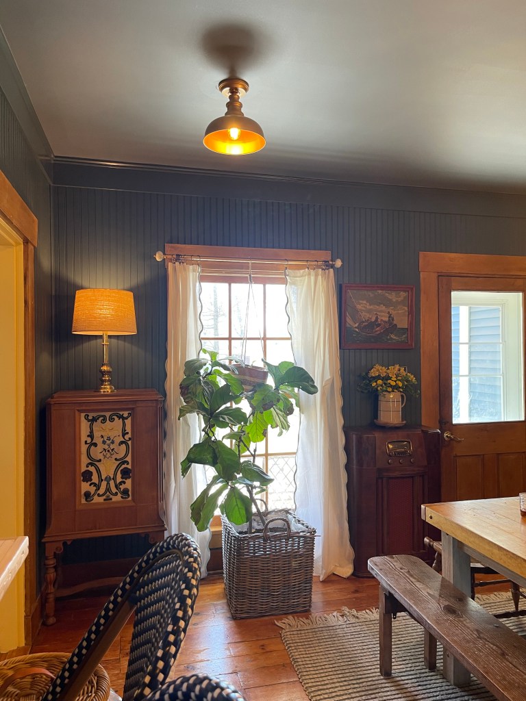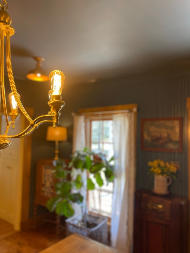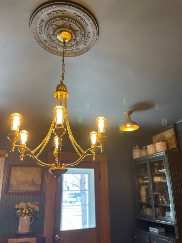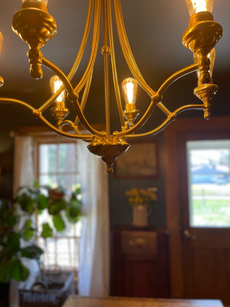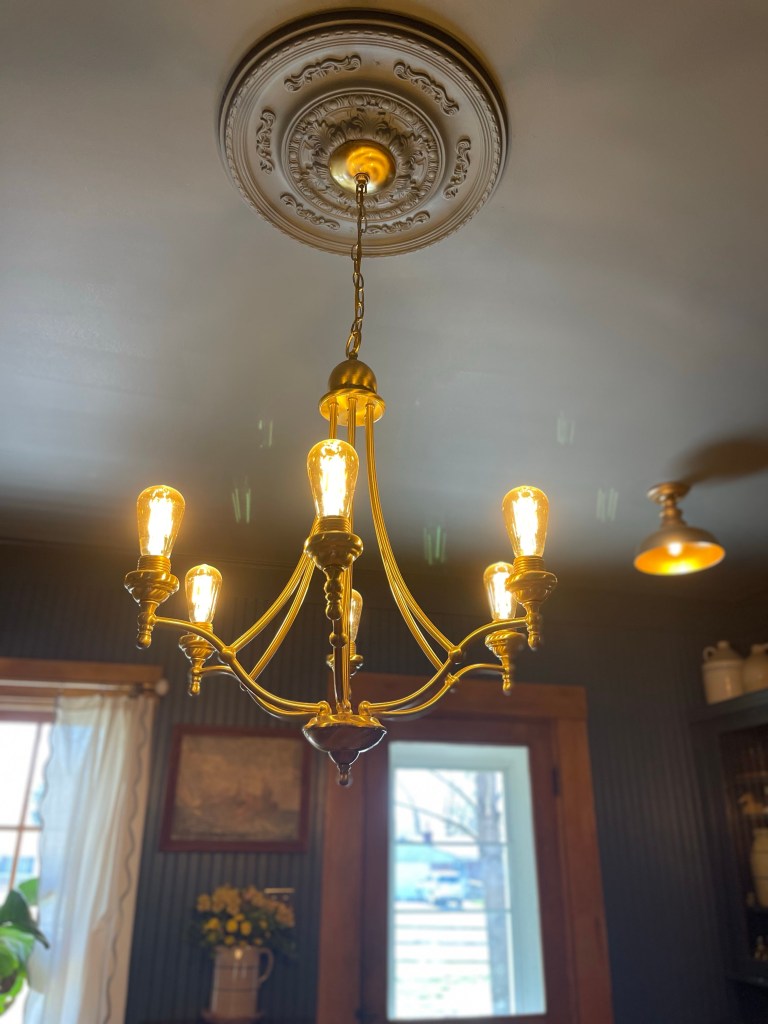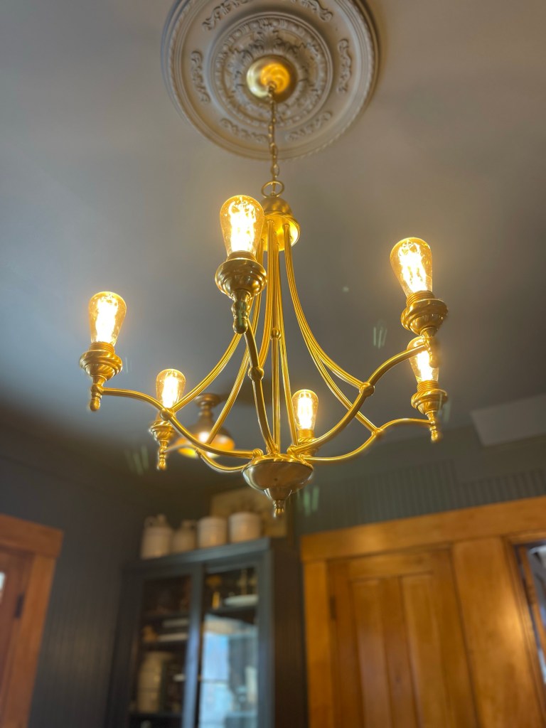 Due to the dining rooms location in the home, it only had one window and a glass paneled door to let light in. The room was fairly dark, but we didn’t have an opportunity to add more windows so we opted for additional lighting. We replaced the original can lights with small brass like lanterns. We would have preferred putting in antique ones, but at the time we were unable to find what we needed in a timely manner, and four matching ones at that.