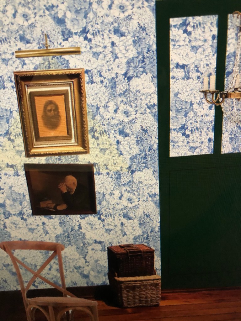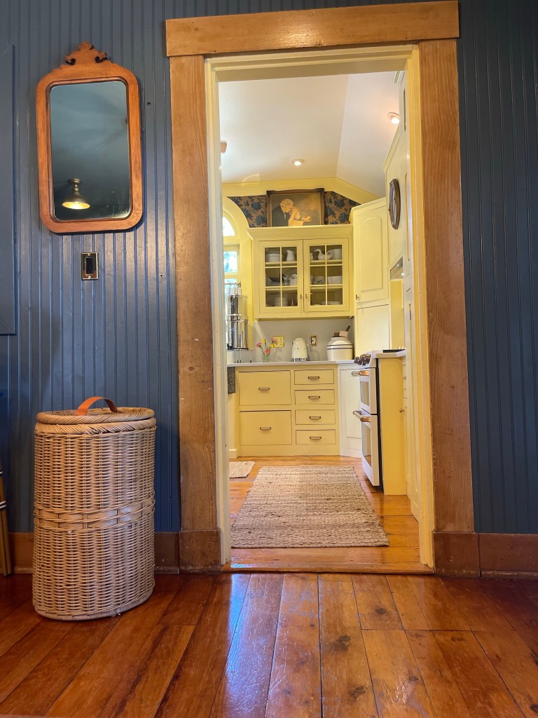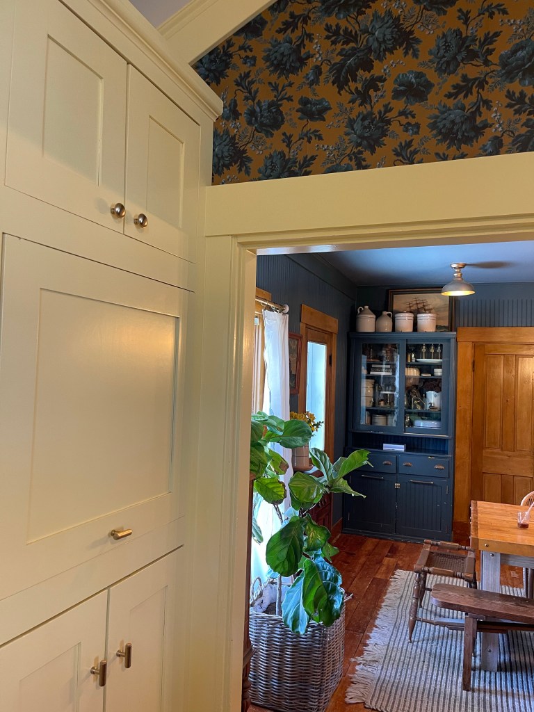 The one below, showing a snippet of the hall, and the kitchen working together quite nicely. A view I came to love. That beautiful wallpaper showing from the kitchen, picking up the hues from the dining room and pulling everything together. The rooms complimenting each other as if they were meant to be.