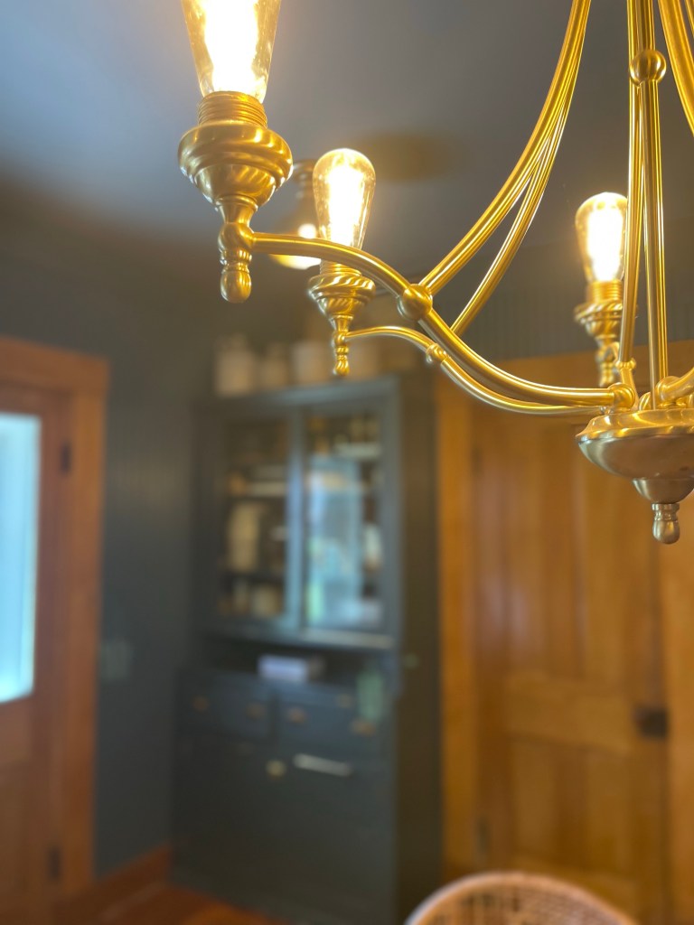 While you saw a sneak peek of this above, we had swapped out the chandelier. We scored this one at a Habitat for Humanity store for $20 bucks. We simply removed the glass laterns, painted the white lightbulb sockets brass and placed Edison bulbs for a simple upgrade. I originally had other editions I was going to make, but ended up nixing the idea for simplicity.