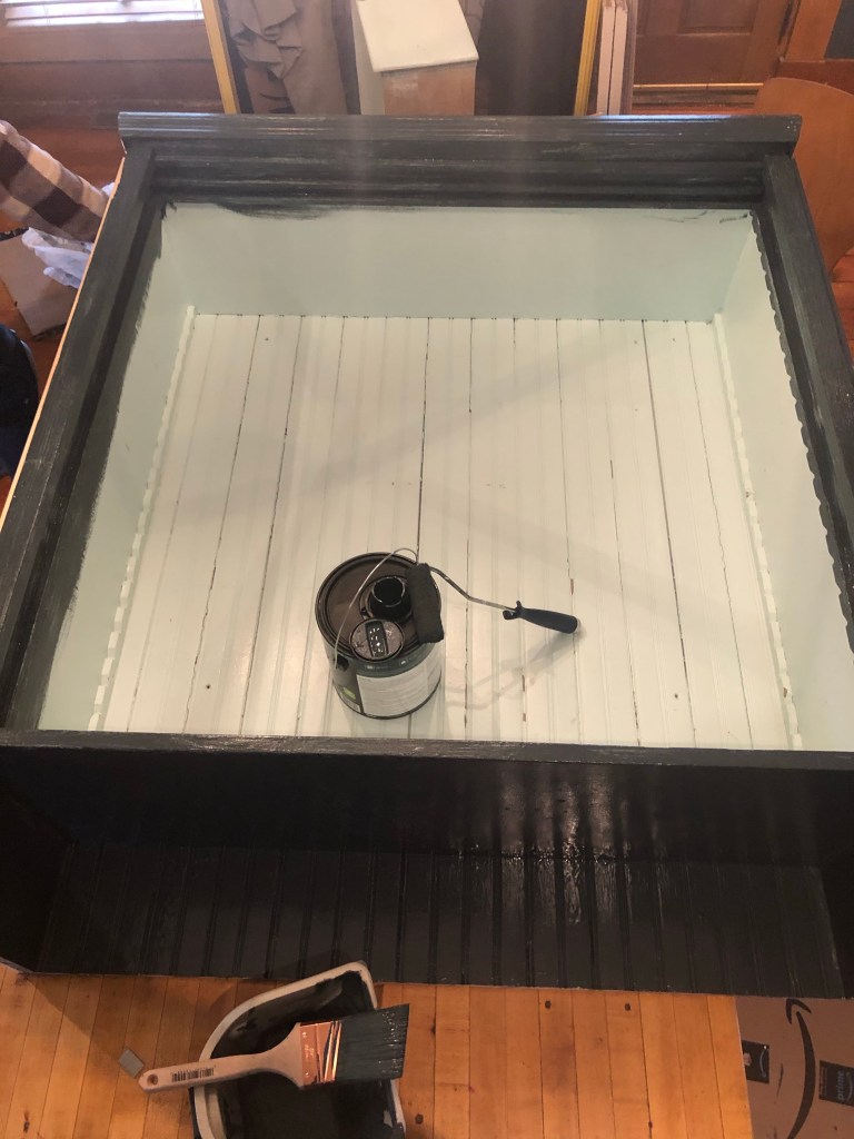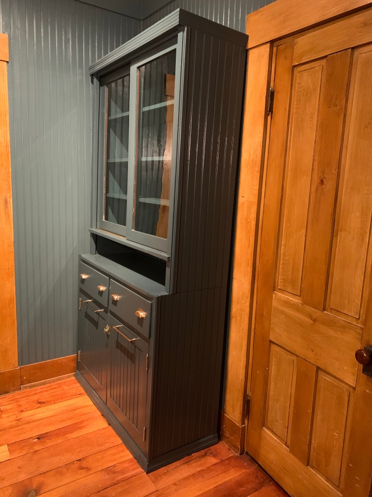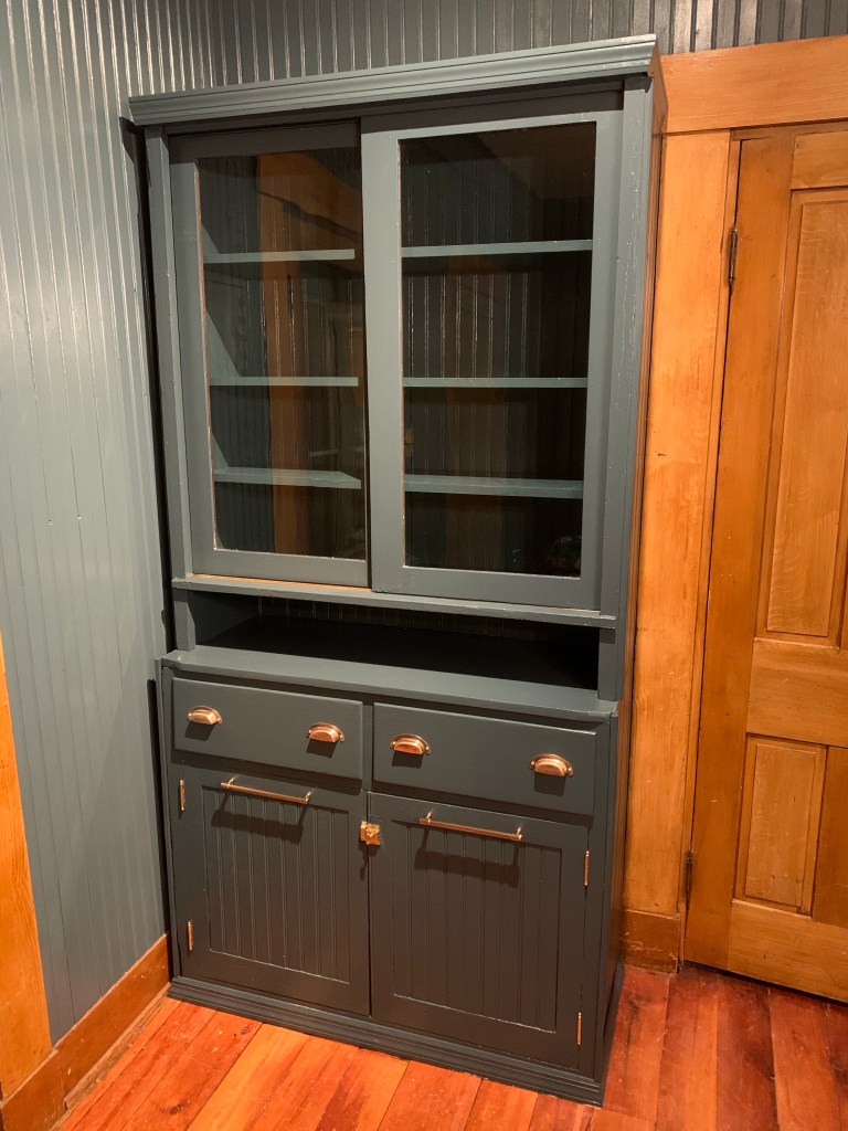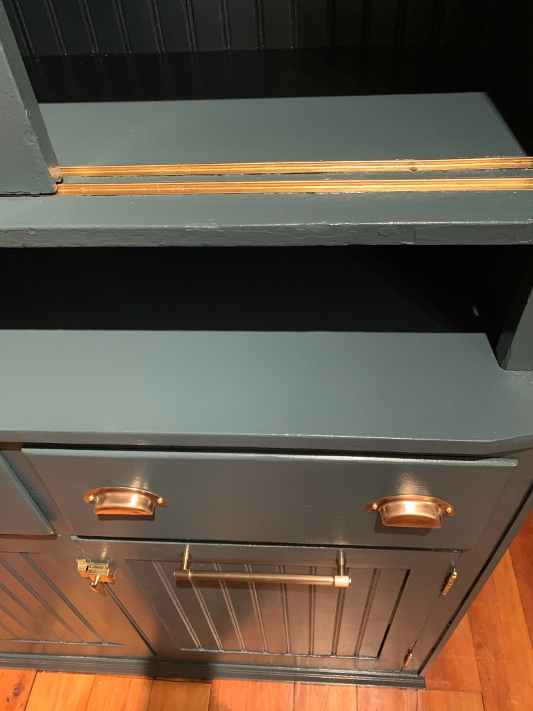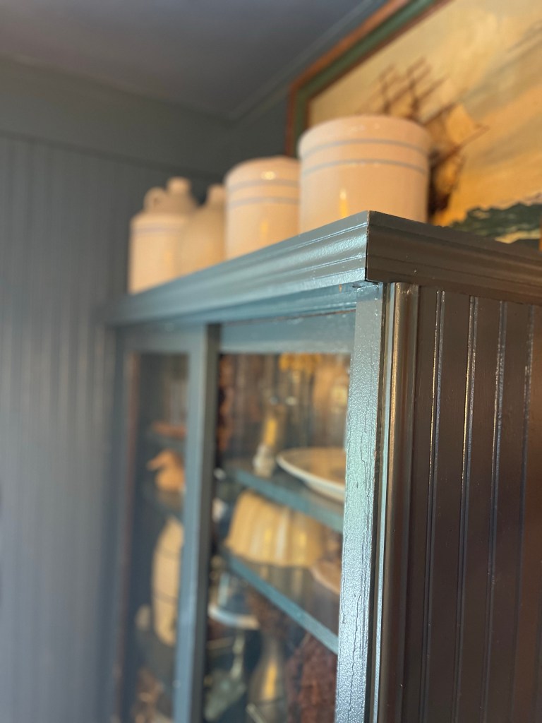 To unify the space more, we painted a very special piece that’s dear to my heart, my Aunt Kelly’s hutch. Since a little girl I have loved this piece. We wanted to make it look as if it were a built-in without actually being a built-in. We chose again, a very similar color but slightly darker, Marquee Behr Paint, Submarine Gray, from Home Depot.