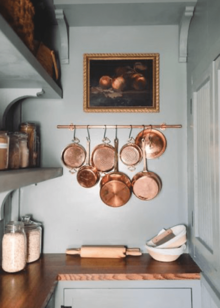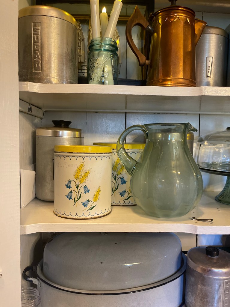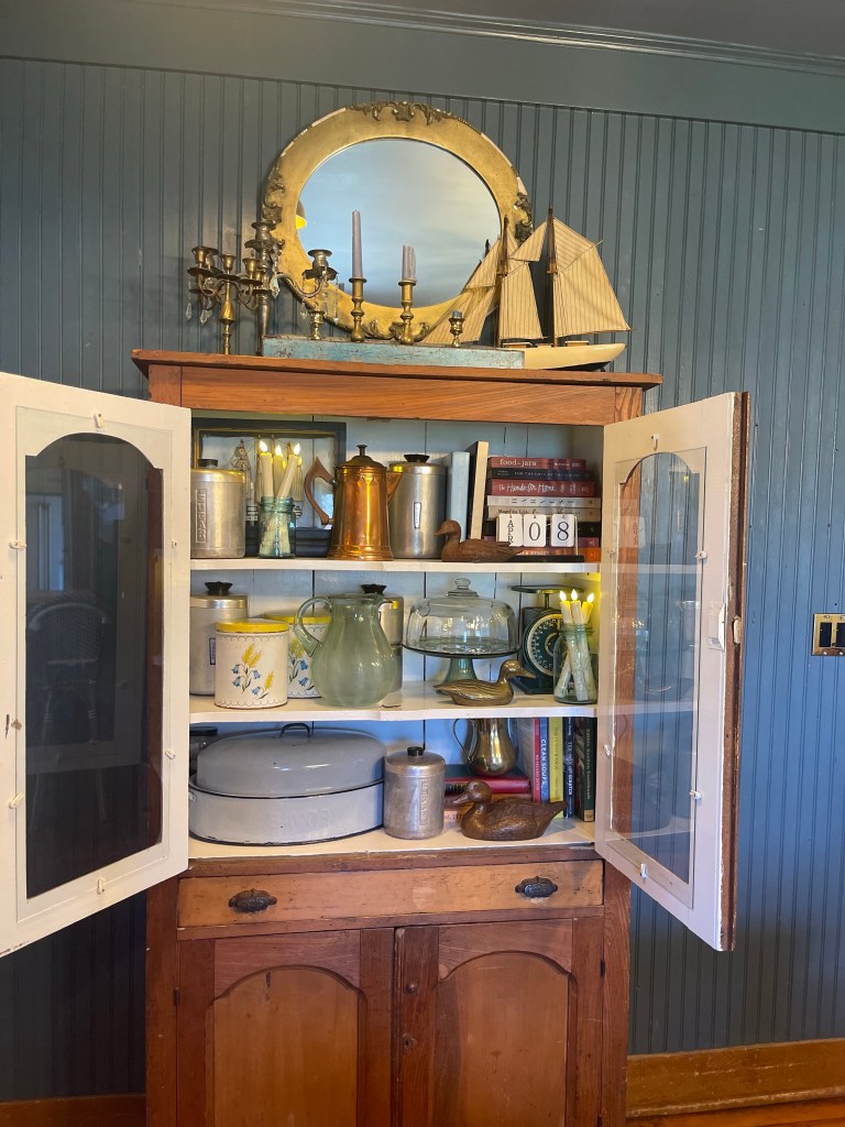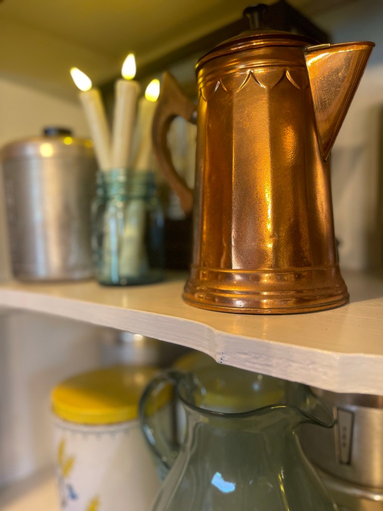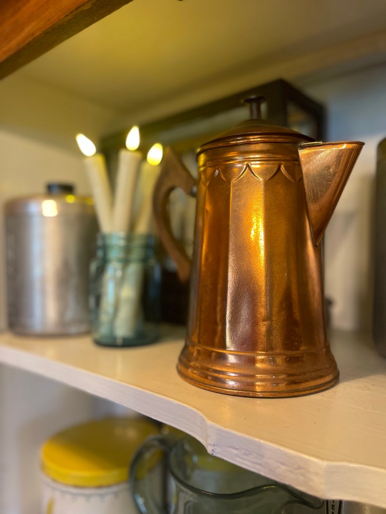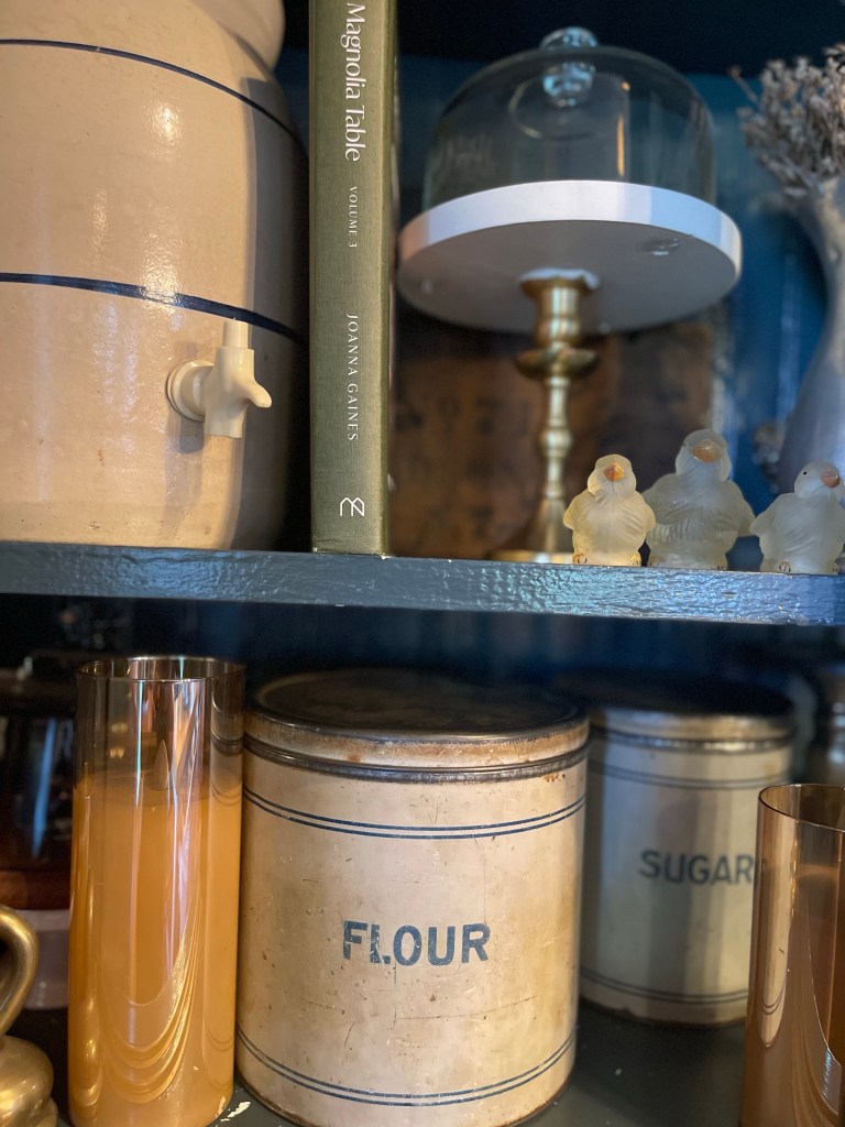 Pieces styled with a mix of metals from copper to brass and silver. From collected canister collections marked with love and age (that also served as smart storage), to illuminating the space with hues of blue candles and (battery operated ones) inside hutches—made our dining room space delightful.