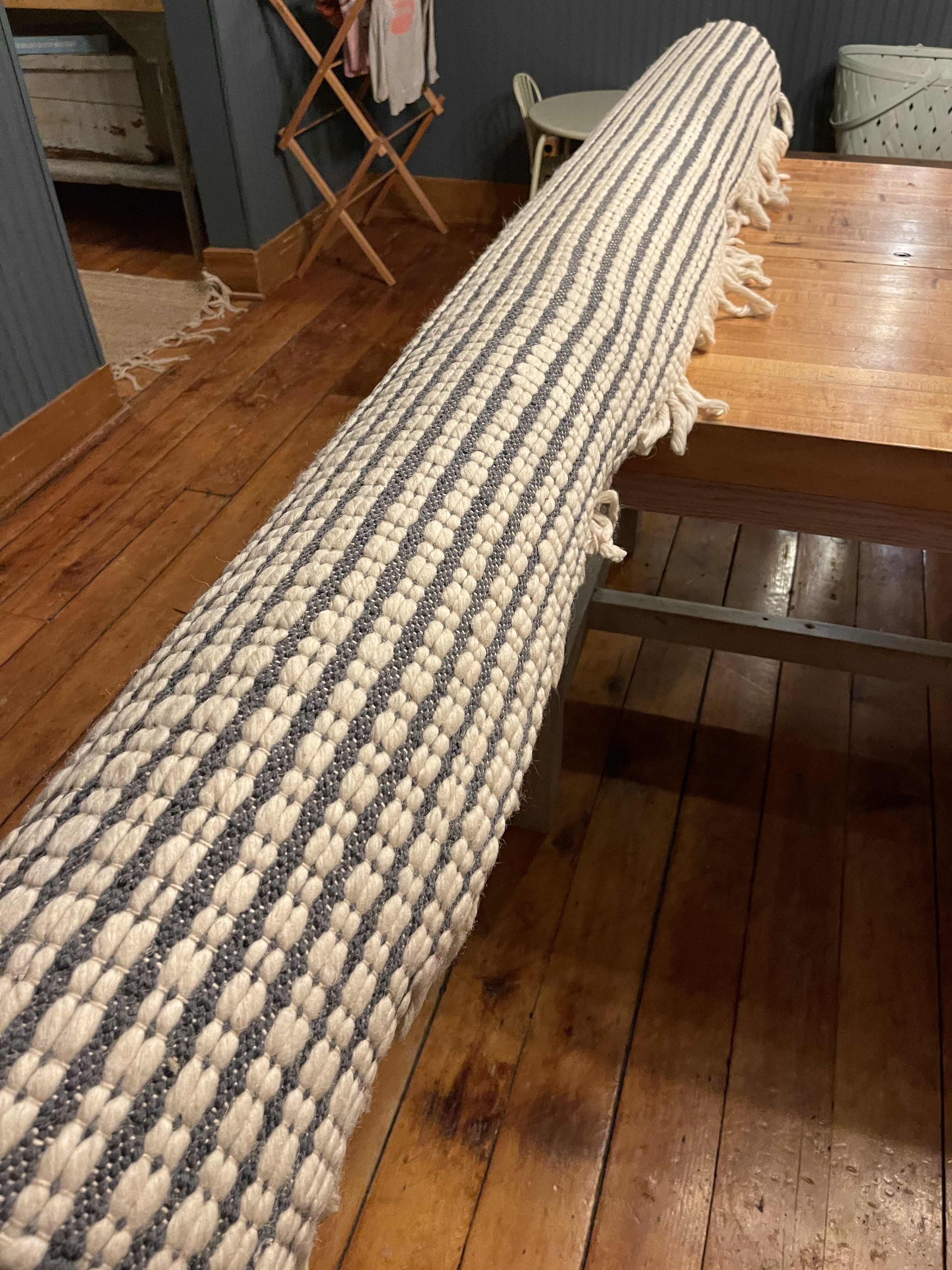 In addition we tried out different chairs as you will see when you scroll through the photos below. Some shots show two larger rattan chairs we purchased on marketplace and others show gorgeous wooden chairs we scored at the curb of a fancy restaurant in Alabama. Their toss out, was one of our greatest scores, and we just so happen to be driving in our truck that day thankfully. Those scores meshed nicely with the true star of the room, our handmade dining room table—which you’ll read about below.