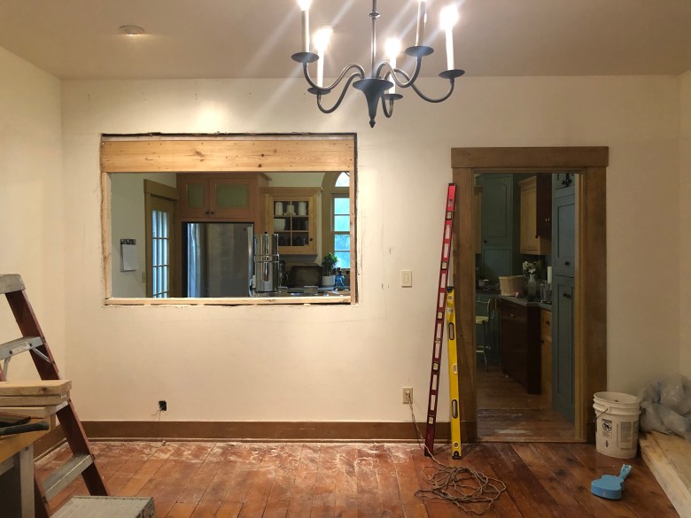 Now we didn’t want to do a whole “open floor plan” thing, because part of the charm of an old home is separate rooms. In honoring that, a total tear down wasn’t happening. We wanted to open it up enough to have eyes and ears to the rest of the house while keeping the charm of an older home intact. Our solution to that problem was to create a unique breakfast nook for the kiddos and all the entertaining we constantly did. Extra seating was a bonus. We of course had not yet done this ourselves. We had built walls but not tore them down. My husband, Tom, is never afraid of a challenge, but once we discovered it was a load bearing wall we decided that was the one job we would hire out for this space for our first time.
