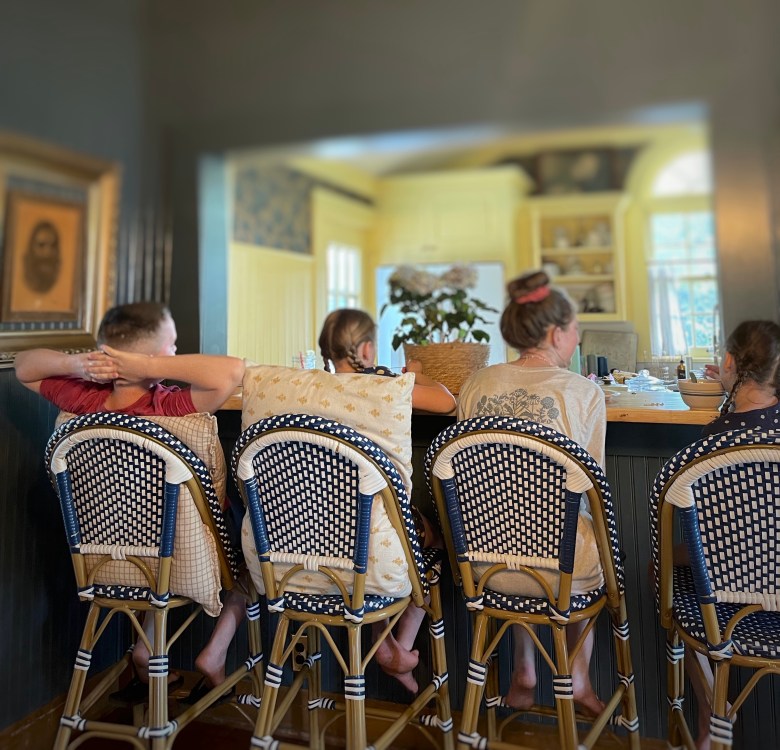 For the counter of it we used an old bowling ball flooring we found on marketplace. Paired with four resin wicker bar stools I’d been dreaming of for each one of our four kiddos.