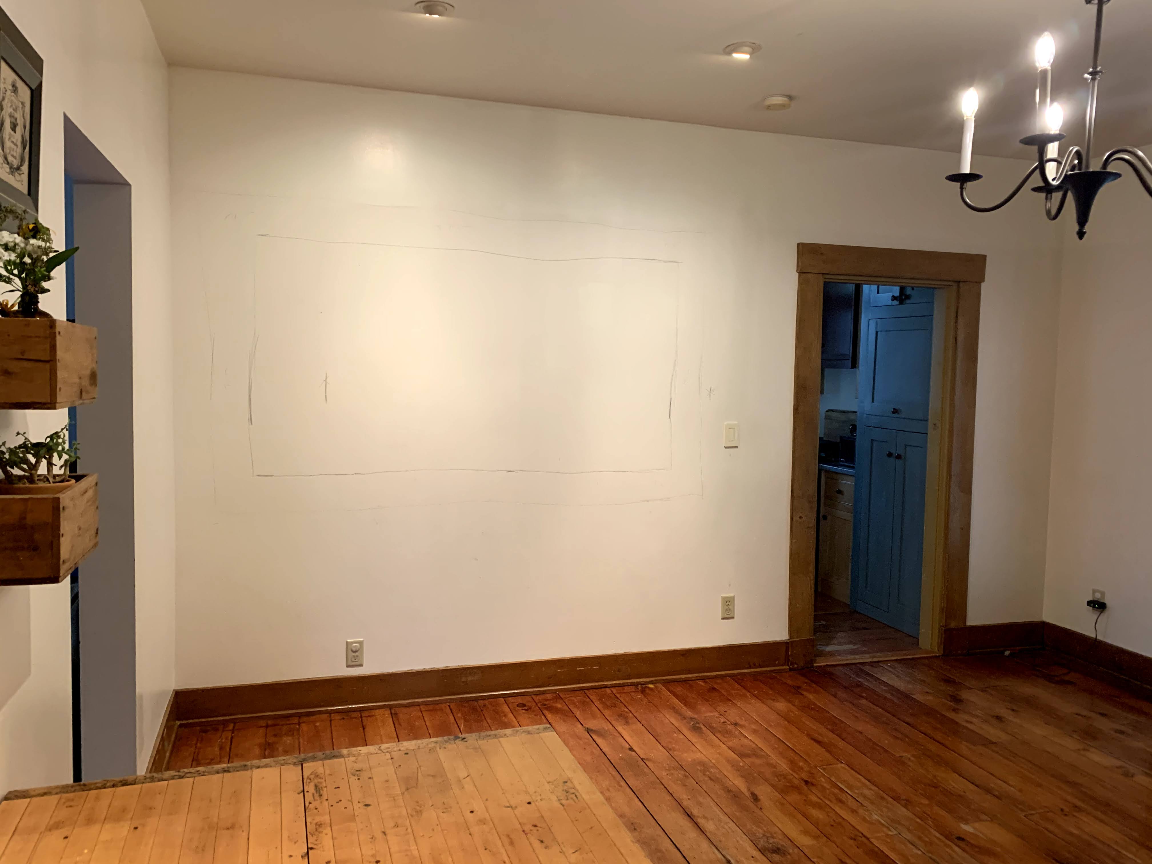 My first “mock up” utilized some epic antique wooden barn doors we had scored that we originally planned to use on a pole barn we were going to build. We knew that wasn’t turning out so I was determined to use them. I sketched up a test wallpaper to get the feel for it in the room with some of the concepts I had in mind for the space initially.