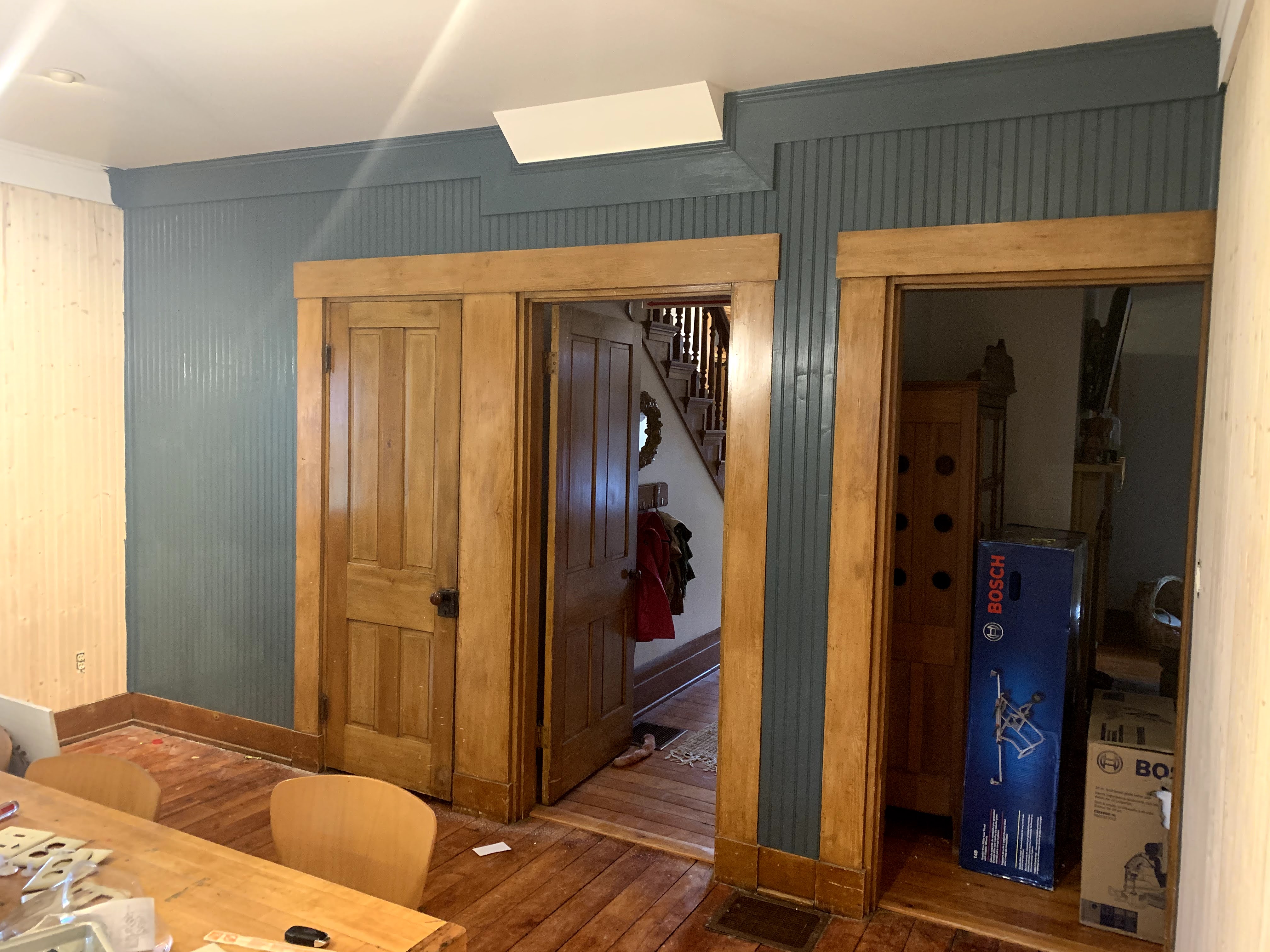 We ended up choosing a deep blue grey called Whale Gray by Marquee Behr Paint from Home Depot and absolutely loved how it turned out. You might recall, Tom kicked me out at this part of the project, as a gift to me for Christmas that year. You can read about that here. During my time away, he knocked out the painting of the dining room. Thanks love.